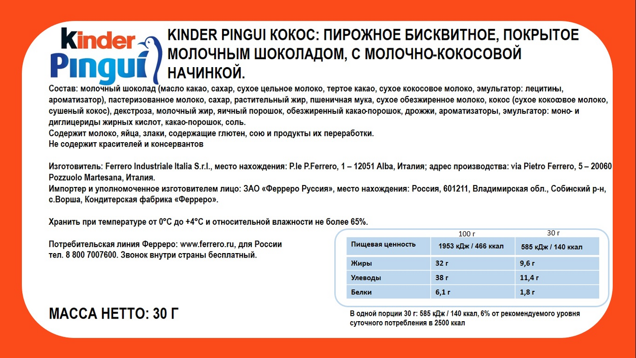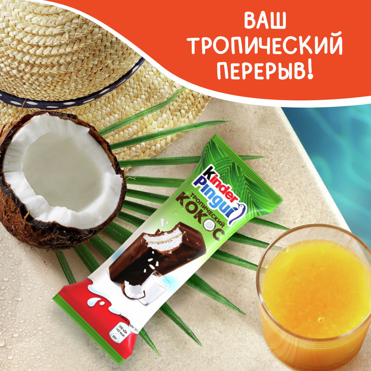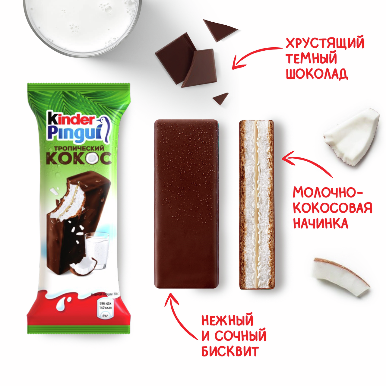 Пирожное Kinder Pingui с кокосом и молоком - отличный перекус в перерыве между работой или на прогулке. Это прекрасное сочетание нежного бисквита, покрытого молочным шоколадом и молочно-кокосовой начинкой. На вкус продукт сладкий, имеет несколько слоев: два молочных и один шоколадный. Натуральная кокосовая стружка дает нежный аромат кокоса. Он изготовлен на основе пастеризованного молока. Kinder Pingui рекомендуется хранить в холодильнике.