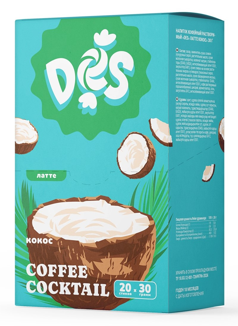 Напиток кофейный Des Латте кокос растворимый, 30г