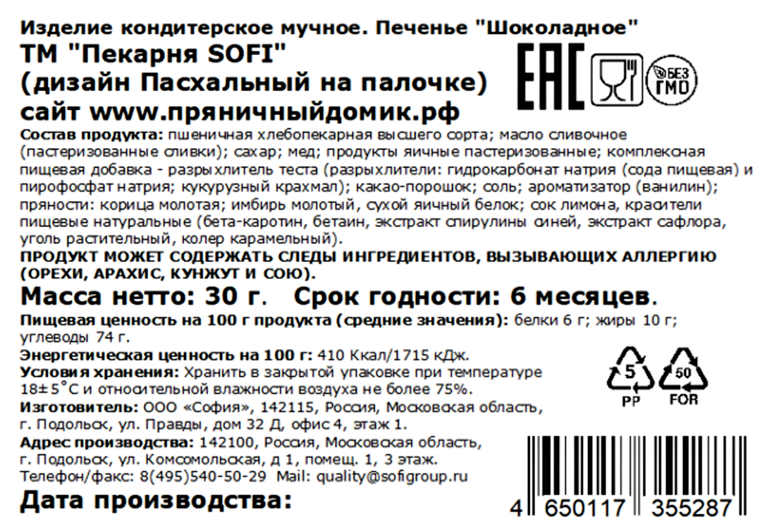 Печенье Пекарня Sofi Пасхальное шоколадное на палочке, 30г