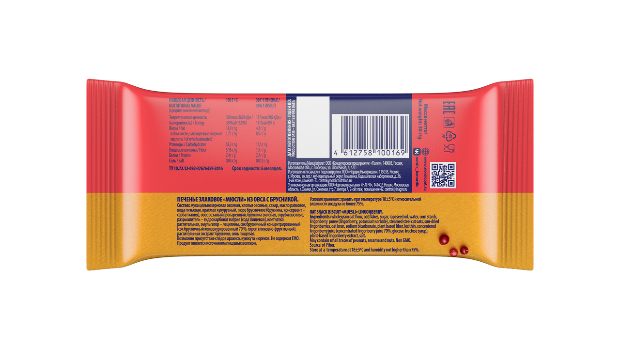 Мука цельнозерновая овсяная, хлопья овсяные, сахар, масло рапсовое, вода питьевая, крахмал кукурузный, пюре брусничное (брусника, консервант – сорбат калия), овес резаный пропаренный, брусника вяленая, отруби овсяные, разрыхлитель – гидрокарбонат натрия (сода пищевая), клетчатка растительная, эмульгатор – лецитины, сок брусничный концентрированный (сок брусничный концентрированный 70 %, сироп глюкозно-фруктозный), растительный экстракт брусники, соль пищевая.