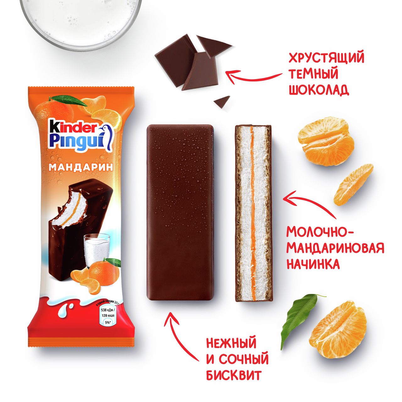Kinder Pingui Мандарин - это сочный бисквит с хрустящим шоколадом и молочно-мандариновой начинкой. Kinder Pingui прекрасно подойдёт для лёгкого перекуса в течение дня. Как и все молочные продукты, хранить Kinder Pingui нужно только в холодильнике. Не содержит красителей и консервантов. Бисквитное пирожное с мягкой молочной начинкой создано как для маленьких, так и для больших сладкоежек. Станет отличным дополнением к чаепитию, неплохим вариантом сладкого лакомства на завтрак или полдник.