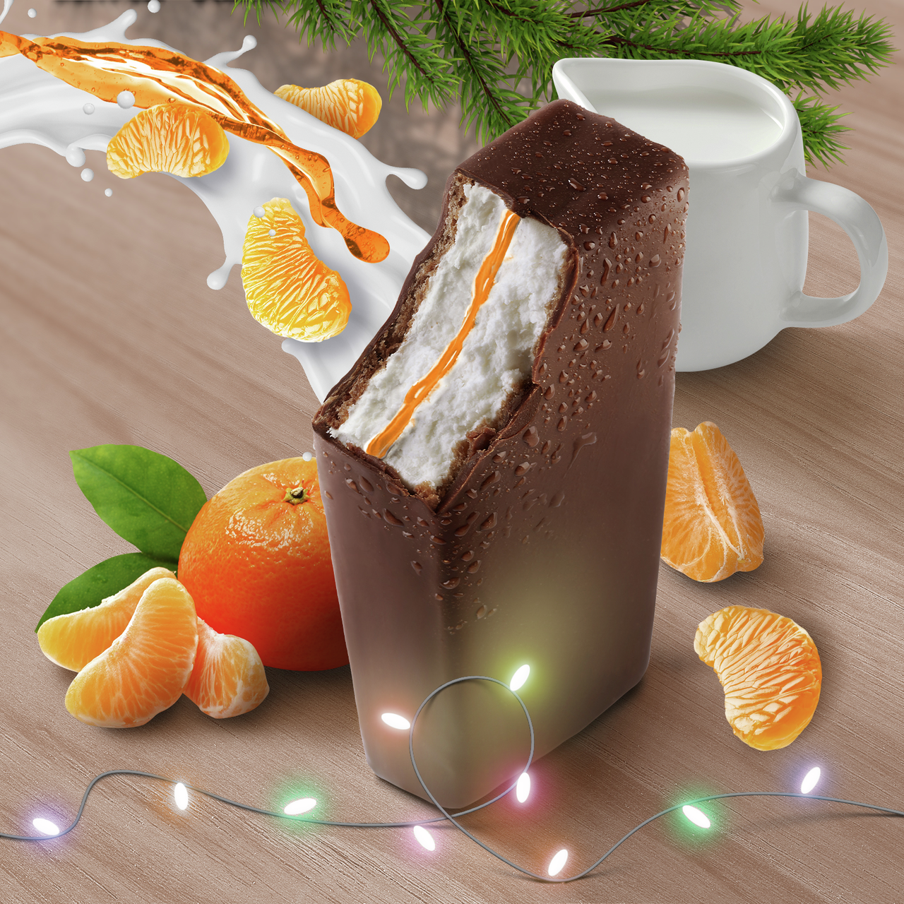 Мандариновая начинка (сахар, концентрированное пюре мандарина, глюкозно-фруктозный сироп, концентрированный сок бузины, регулятор кислотности: лимонная кислота, пектин, ароматизатор), шоколад (сахар, тертое какао, масло какао, эмульгатор: лецитин (соевый и/или подсолнечный), ароматизатор: ванилин), пастеризованное молоко, сахар, растительный жир, пшеничная мука, сухое обезжиренное молоко, обезвоженный молочный жир, декстроза, яичный порошок, обезжиренный какао-порошок, хлебопекарные дрожжи, эмульгатор: моно- и диглицериды жирных кислот, сухой экстракт ячменного солода, соль.
