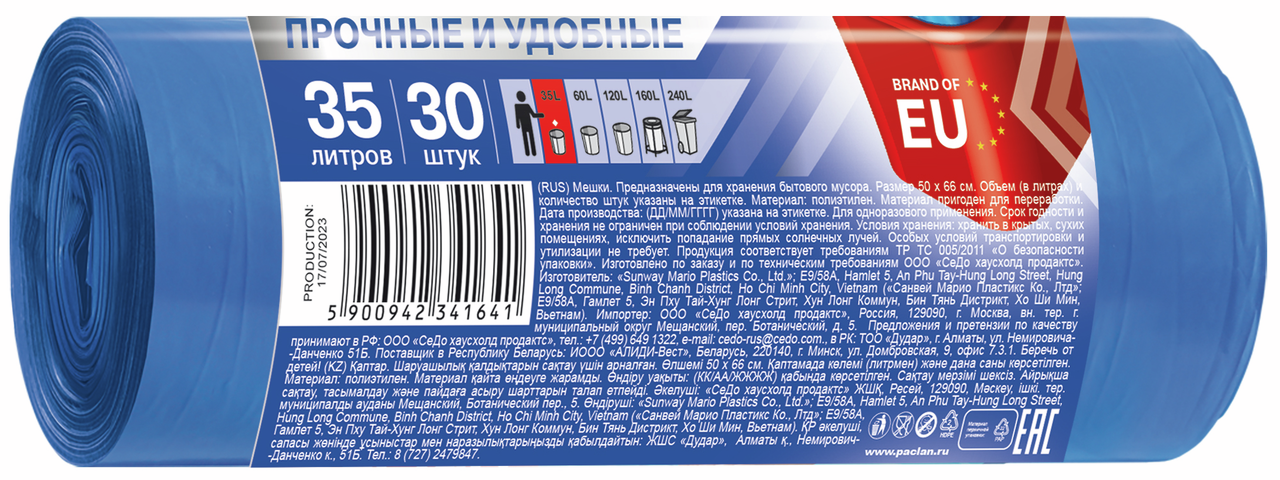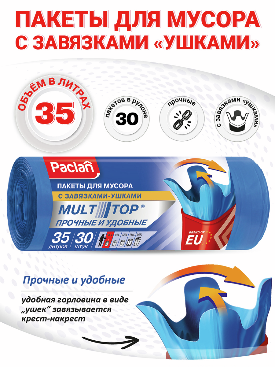 Мешки мусорные Paclan Multitop 35 л, 30 шт. представлены в виде рулона. Компактная упаковка не занимает много места при хранении. Для удобства использования каждый пакет отделен от последующего при помощи перфорации. Мешки легко отрываются друг от друга, сохраняя целостность. Завязки выполнены в виде четырех ушек из единого куска полиэтилена, из того же материала, что и пакет. После его наполнения ушки нужно завязать крест-накрест. Донный шов Звезда выдержит большой вес, т. к. он создан из восьми спаянных слоев полиэтилена. Пакет выдерживает бытовой мусор и не рвется при попытке его завязать. Такие изделия могут использоваться в быту, государственных учреждениях, офисах. Срок годности не ограничен. Рулон необходимо хранить в сухих помещениях на расстоянии не менее 1 м вдали от приборов отопления и прямых солнечных лучей.