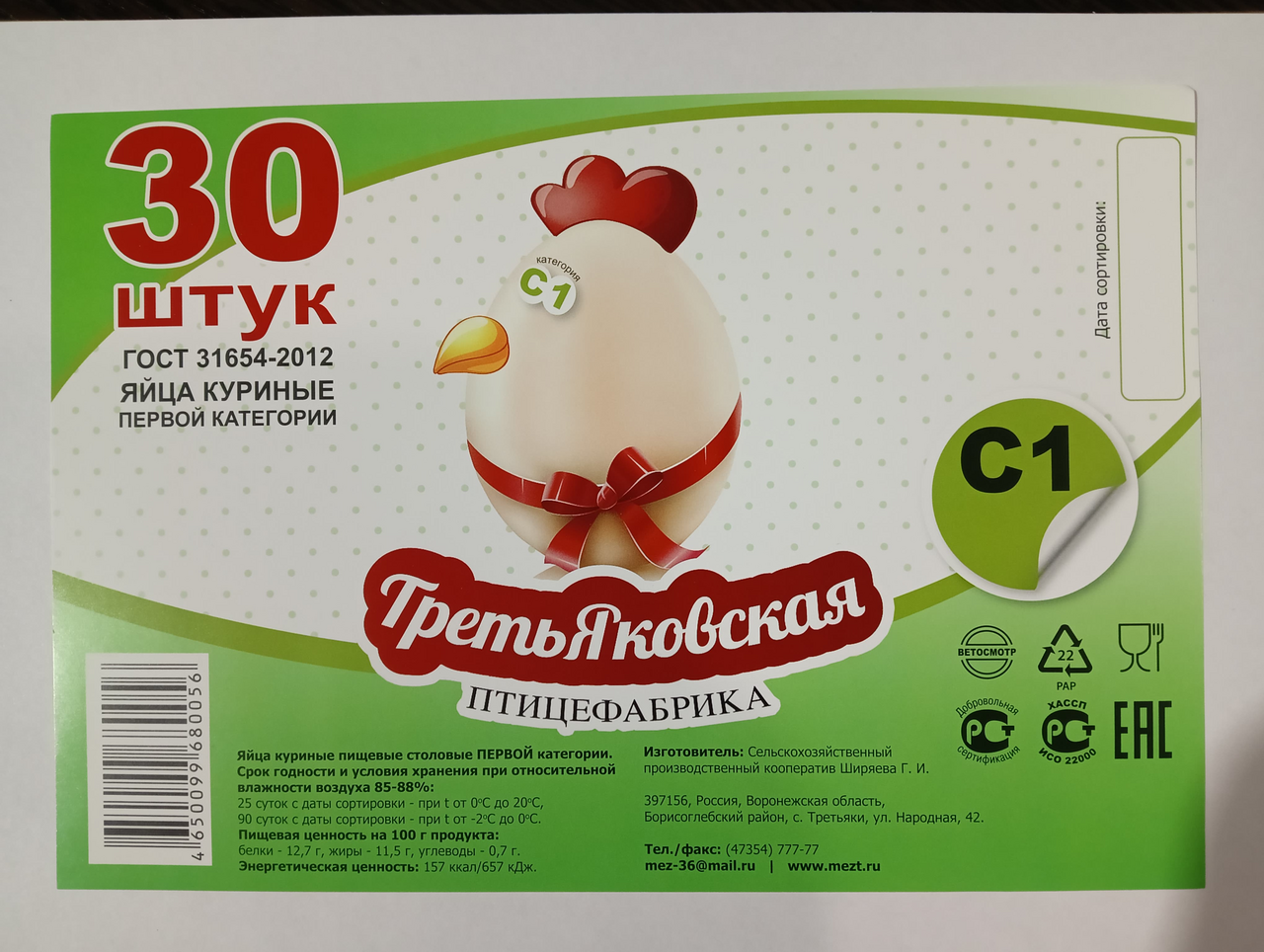 Яйцо куриное Третьяковская ПФ пищевое столовое С1, 30шт