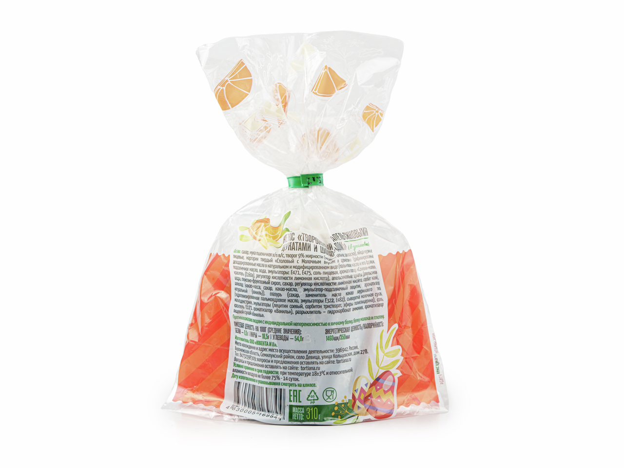 Сахар, мука пшеничная хлебопекарная высшего сорта, творог 9% жирности (молоко цельное, закваска), яйца куриные пищевые, маргарин твердый Столовый с Молочным вкусом и ароматом (рафинированные дезодорированные масла в натуральном и модифицированном виде (пальмовое масло и его фракции, подсолнечное масло, вода, эмульгаторы: E471, E475, соль пищевая, ароматизатор Сливки-молоко, краситель (E160а), регулятор кислотности лимонная кислота), апельсиновые цукаты (апельсиновая цедра, глюкозно-фруктозный сироп, сахар, регулятор кислотности: лимонная кислота, сорбат калия), шоколад (какао-масса, сахар, какао-масло, эмульгатор-подсолнечный лецитин, ароматизатор натуральный (ваниль)), глазурь (сахар, заменитель масла какао лауринового типа (гидрогенизированное пальмоядровое масло, эмульгаторы E322, E482), сыворотка молочная сухая, мальтодекстрин, эмульгаторы (лецитин соевый, сорбитан тристеарат, эфиры полиглицерина), соль, краситель E171, ароматизатор Ваниль), разрыхлитель - гидрокарбонат аммония, ароматизатор (идентичный натуральному) - ванилин.