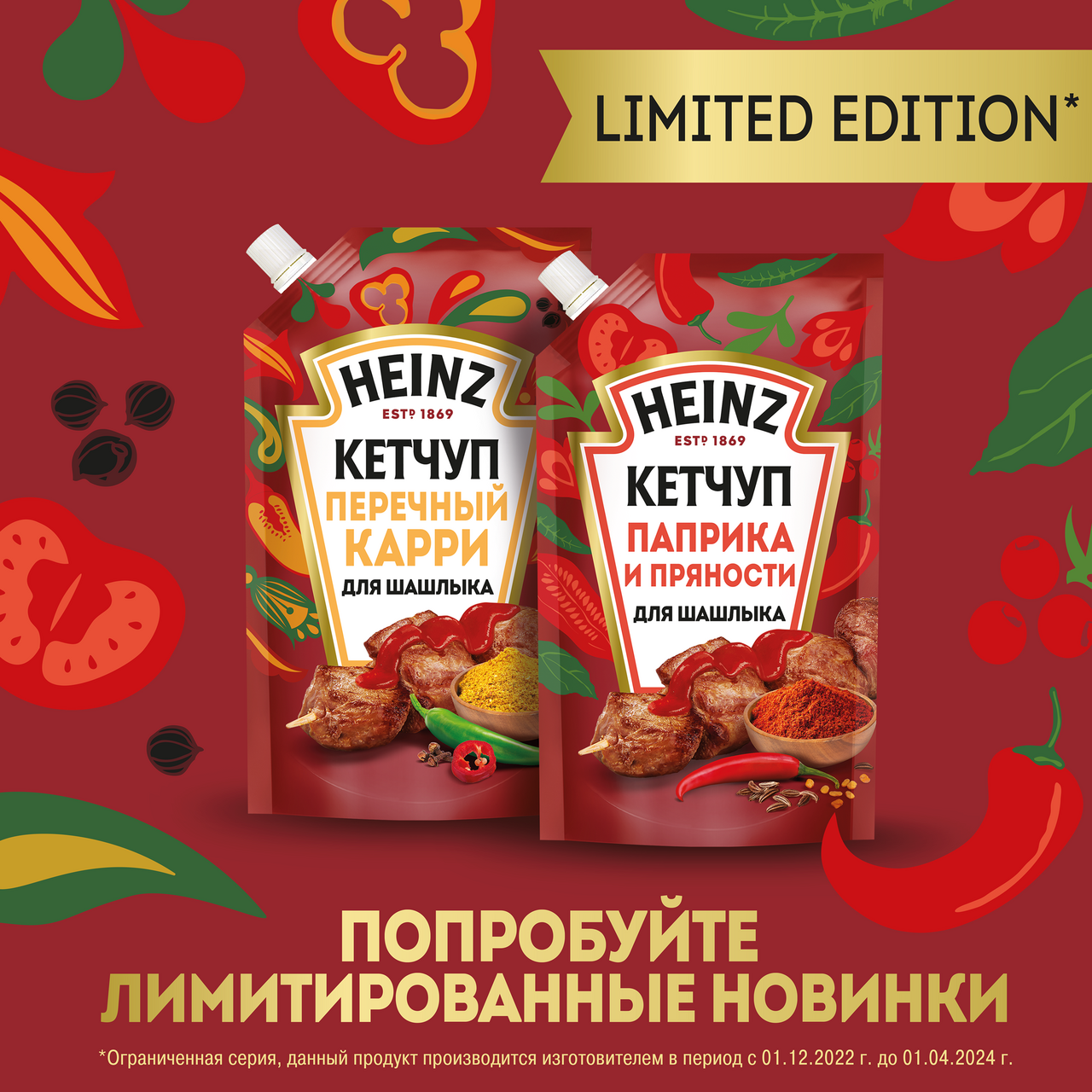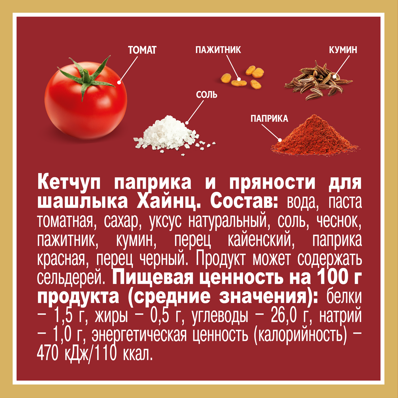 Томатный Кетчуп с паприкой и пряностями для шашлыка — это лимитированная новинка от Heinz, великолепный шашлычный кетчуп из натуральной томатной пасты и целым букетом ароматных приправ. Помимо экстрактов кумина и пажитника, кетчуп содержит целых три вида перца — красную паприку, черный и кайенский. Тройной перечный аккорд порадует любителей шашлыков и других видов мяса на гриле. К отборной томатной пасте Heinz добавляет фирменную смесь специй, несколько дополнительных ингредиентов и, конечно же, свою любовь. Heinz - все дело в томатах.