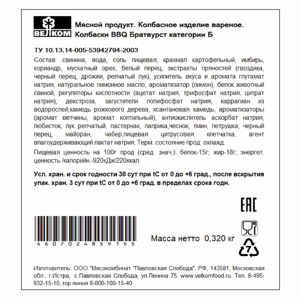 Свинина, вода, соль пищевая, крахмал картофельный, имбирь, кориандр, мускатный орех, белый перец, экстракты пряностей гвоздика, черный перец, дрожжи, репчатый лук, усилитель вкуса и аромата глутамат натрия, натуральное лимонное масло, ароматизатор лимон, белок животный свиной, регуляторы кислотности ацетат натрия, трифосфат натрия, цитрат натрия, декстроза, загустители полифосфат натрия, каррагинан из водорослей, камедь рожкового дерева, ксантановая камедь, ароматизаторы аромат ветчины, аромат коптильный, антиокислитель аскорбат натрия, любисток, лук репчатый, пастернак, паприка, чеснок, тмин, петрушка, черный перец, майоран, чабер, пищевая цитрусовая клетчатка, агент влагоудерживающий лактат натрия.