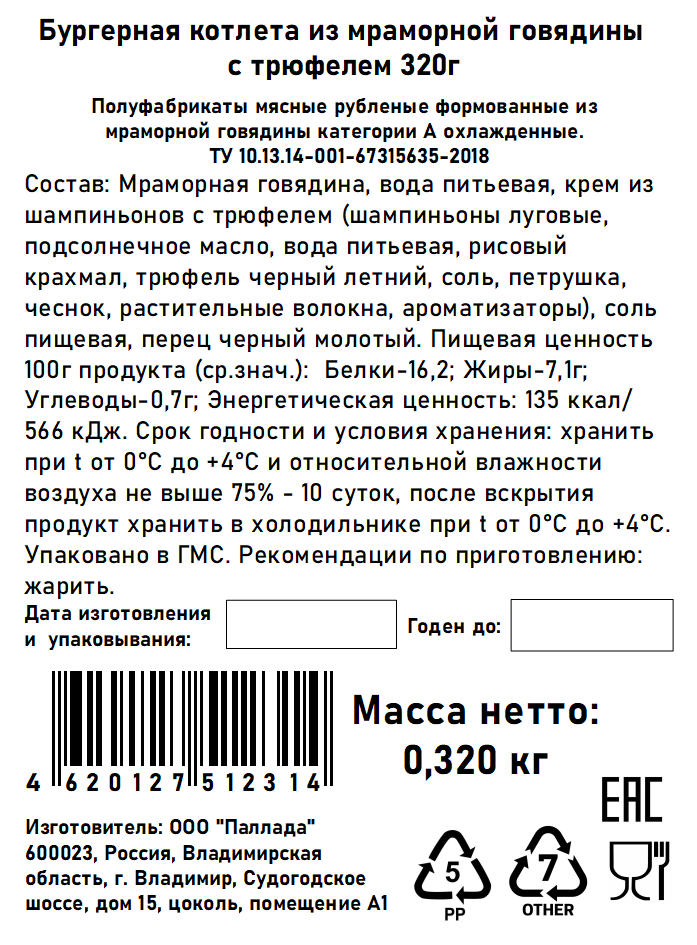 Наша компания производит не только вкусные, премиальные стейки влажного и сухого созревания, правильные колбаски с нестандартными вкусовыми решениями, а так же бургерные и классические котлеты. Котлеты получились настоящие, вкусные и сочные. Трюфель бургер с котлетой из мраморной говядины, подается с картофелем фри. Идеальны для приготовления бургеров. Котлеты находятся в герметичной упаковке и полностью готовы для жарки, что может сильно сэкономить Ваше время. Фарш из мраморной говядины очень нежный и деликатный, поэтому после вскрытия упаковки в холодильнике может храниться не более 12 часов.