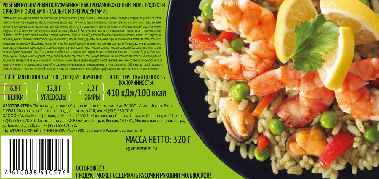 Рис, кальмар индийский бланшированный (кольца, полоски) (Loligo Duvaceli), мясо мидий чилийских варено-мороженое (Mytilus chilensis), креветки белоногие очищенные варено-мороженые (Litopenaeus vannamei), перец болгарский, горошек зелёный, лук, биск (вода, креветки белоногие (Litopenaeus vannamei), приправа для паэльи (соль, сахар, томаты сушёные, лук, чеснок гранулированный, перец красный сладкий, куркума, петрушка, чёрный перец молотый, орегано молотый, розмарин); рис, щупальца, полоски, кусочки кальмара тихоокеанского сыро-мороженые (Todarodes Pacificus), мясо мидий чилийских варено-мороженое (Mytilus chilensis), креветки белоногие очищенные варено-мороженые (Litopenaeus vannamei), креветки очищенные сыро-мороженые (Solenocera Melantho), биск (вода, креветки белоногие (Litopenaeus vannamei), перец болгарский, горошек зелёный, лук, приправа для паэльи (соль, сахар, томаты сушёные, лук, чеснок гранулированный, перец красный сладкий, куркума, петрушка, чёрный перец молотый, орегано молотый, розмарин).