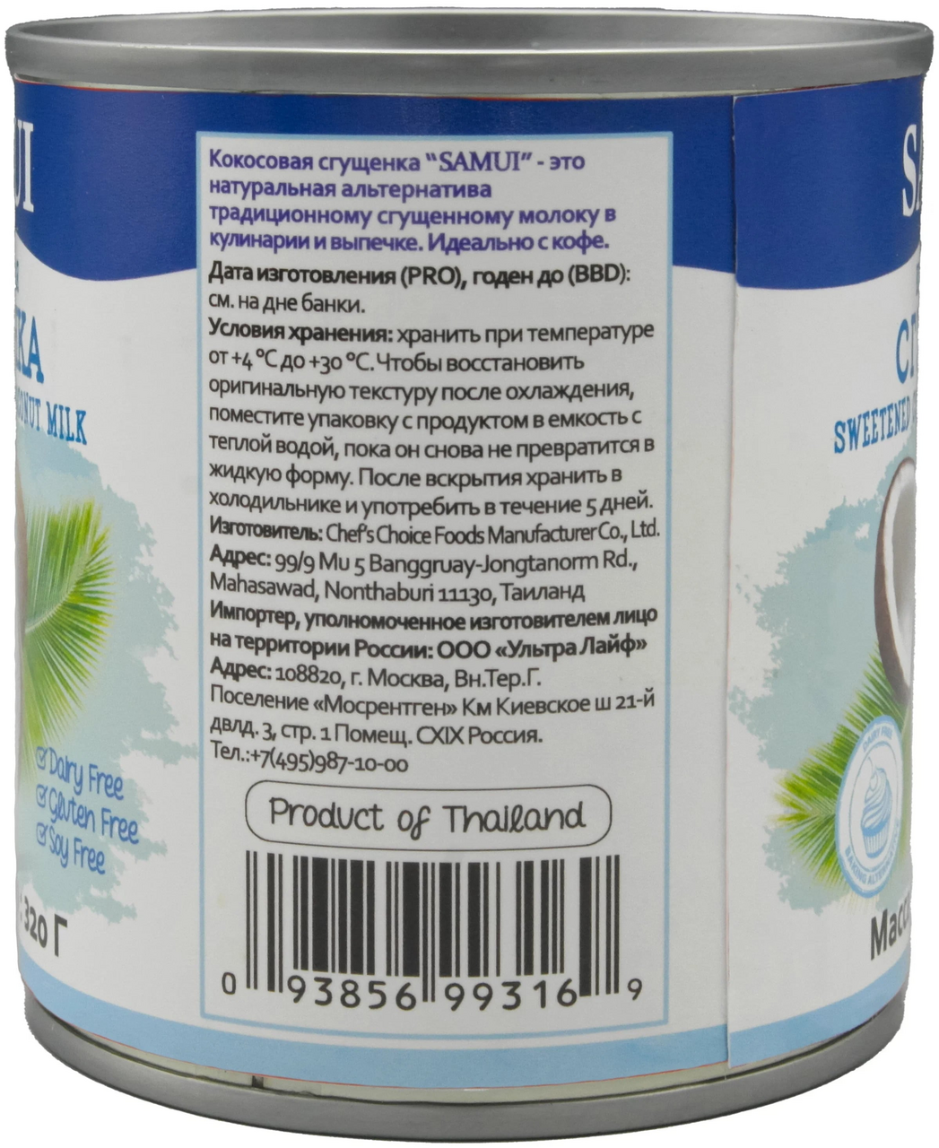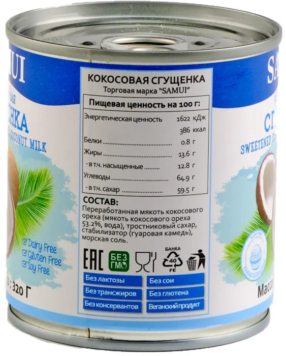 Кокосовая сгущенка Samui растительная, 320г премиального качества, произведена из отборных тайских кокосов. Нежнейшая текстура, в меру сладкая. Кокосовый вкус превратит обычные блинчики в шикарный десерт и станет вкусным дополнением к чаю или кофе.