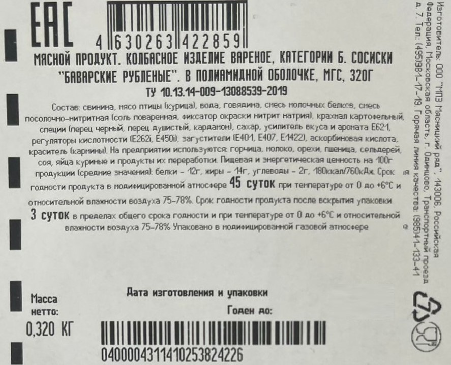 Сосиски Мясницкий ряд Баварские рубленые вареные охлажденные, 320г