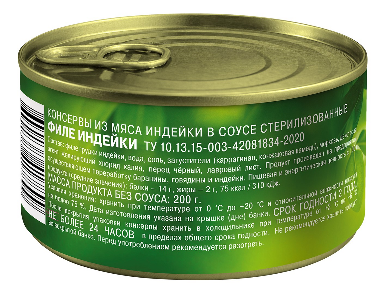 Мясо индейки, вода, морковь, соль, регуляторы кислотности: цитрат натрия, гидрокарбонат натрия, цитрат калия, мальтодекстрин, стабилизатор каррагинан, агент желирующий хлорид калия, загустители: конжаковая камедь, ксантановая камедь, лавровый лист, перец чёрный.