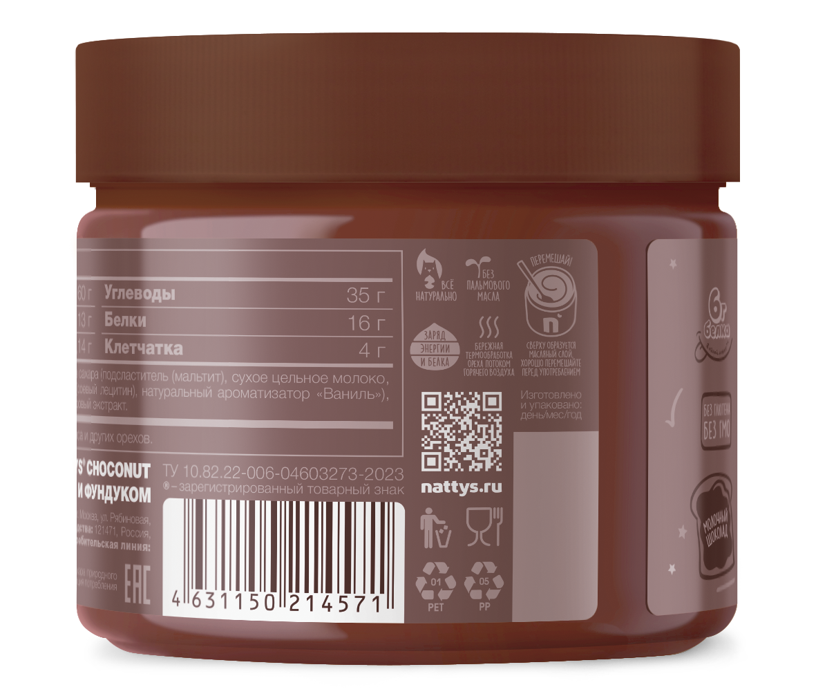 Это паста из цельных ядер фундука, арахиса и молочного шоколада, абсолютно натуральная, приготовленная по особому рецепту, без добавления сахара, с чистым составом. Приготовлена по домашнему рецепту из отборных сортов фундука, арахиса и какао, с добавлением натурального мёда и морской соли. Вкус и пользу Nattys вобрал из своих натуральных компонентов: фундук богат мононенасыщенными жирными кислотами, кото��ые помогают снижать уровень холестерина и сжигают жировые клетки; арахис содержит много белка (усваивается на 98%) и клетчатки, что способствует длительному ощущению сытости и является основой здорового питания. Хрустящий хлеб с шоколадной пастой Nattys - традиционный любимый завтрак с детства, который поднимет настроение и наполнит день улыбкой.