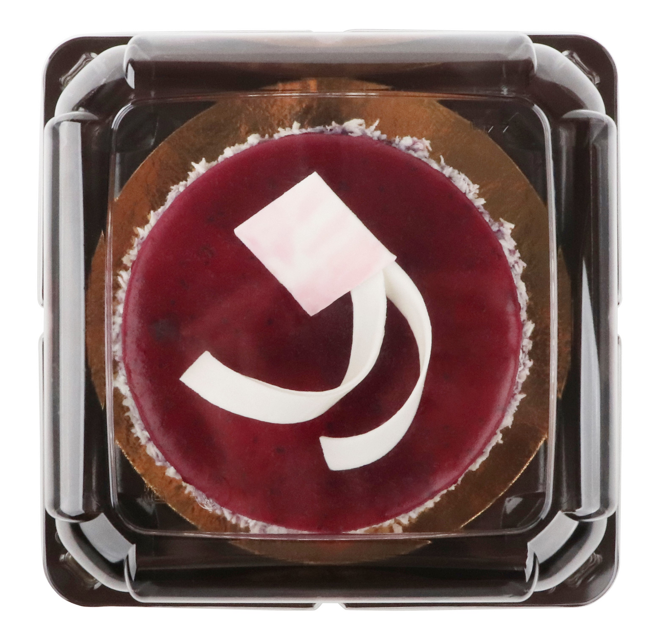 Тонкий нежный бисквит, ванильный мусс, прослойка из черной смородины в сиропе и йогуртово-черничный мусс. Торт глазирован гляссажем из черной смородины.