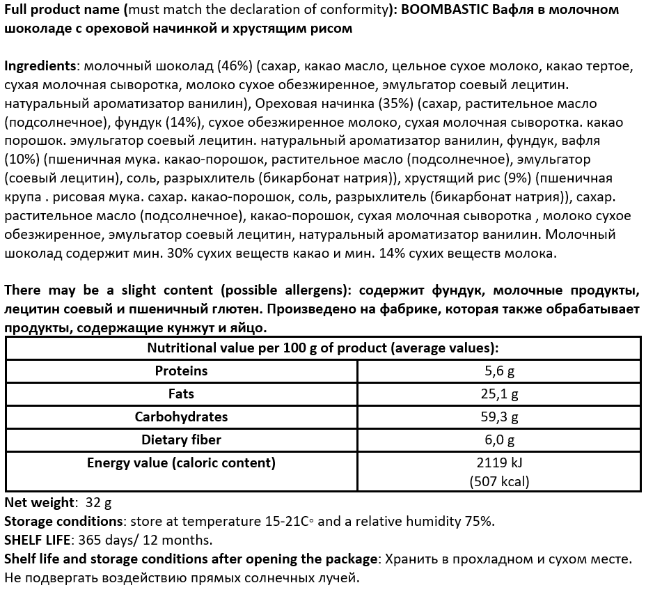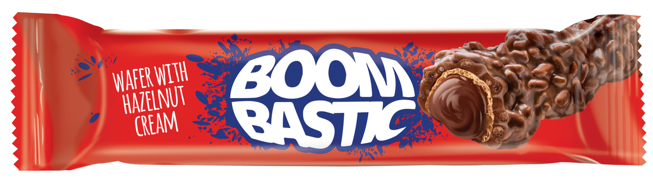 Вафля Boombastic в молочном шоколаде с ореховой начинкой и хрустящим рисом, 32г х 12 шт