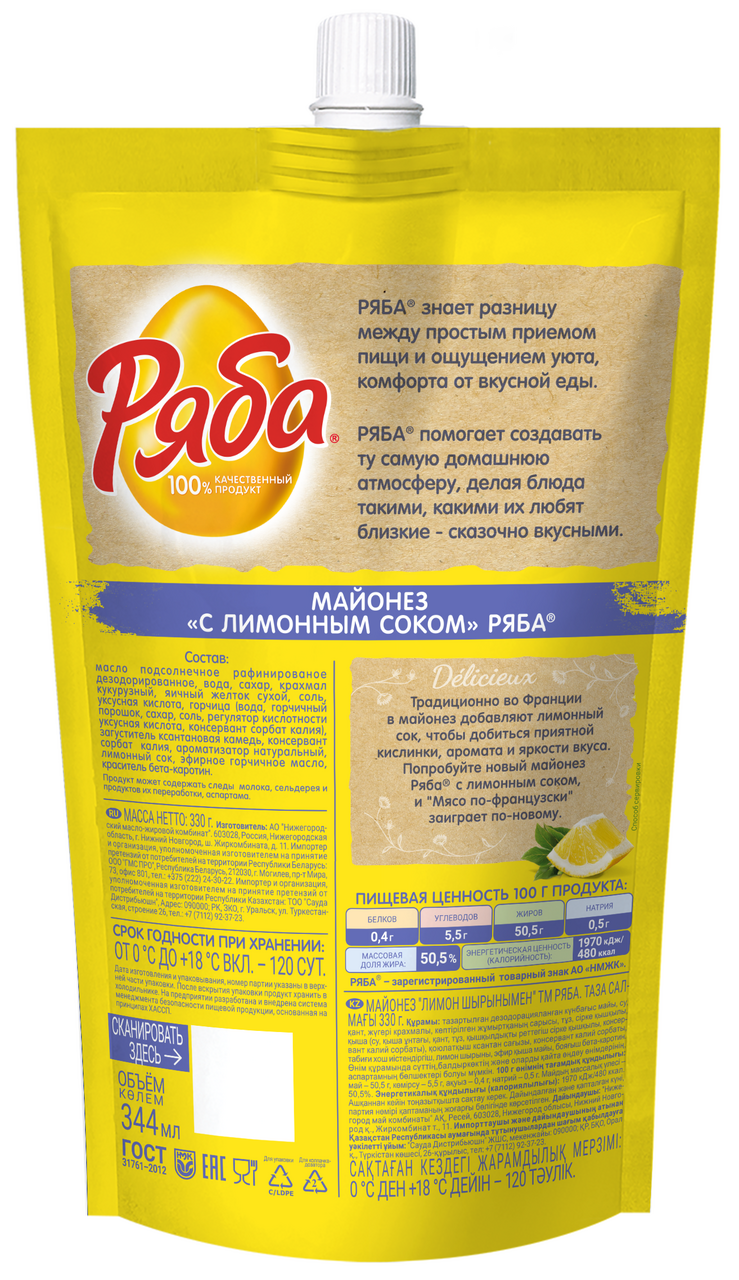 Майонез с лимонным соком - это ответ бренда на французский рецепт майонеза. Традиционно во Франции в майонез добавляют лимонный сок, чтобы добиться пикантности вкуса. Майонез Ряба С лимонным соком обладает приятной кислинкой, горчичным послевкусием и интересным ароматом лимона.