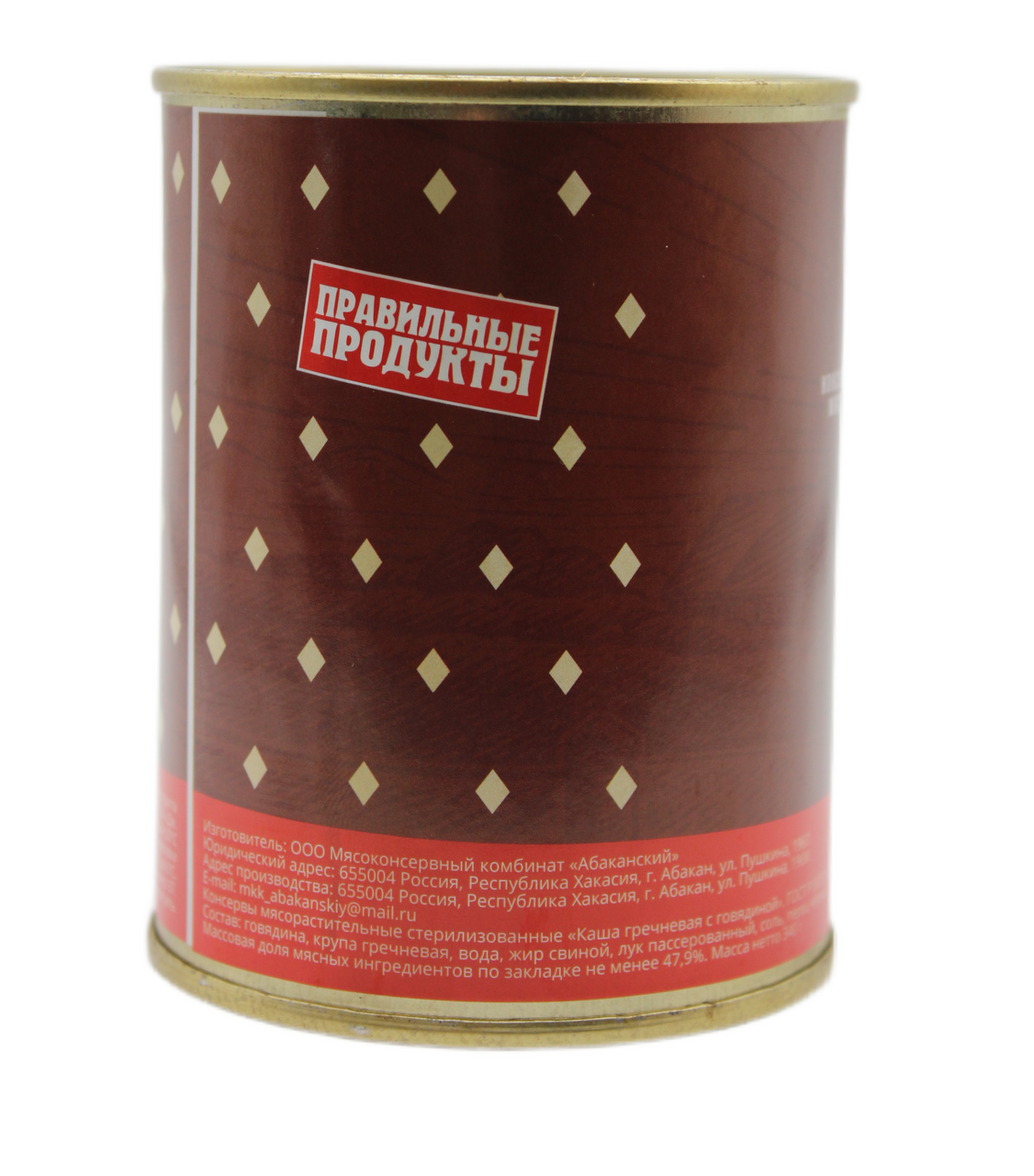 Говядина, крупа гречневая, вода, жир свиной, лук пассерованный, соль, перец черный.
