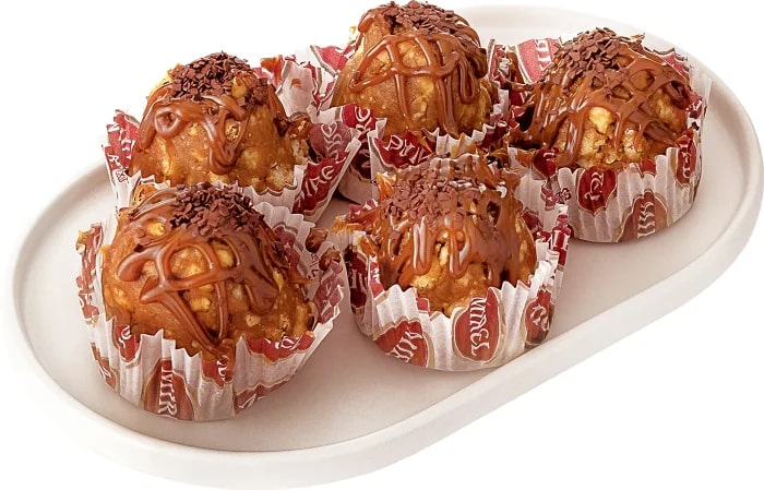 Мука пшеничная в/с, консервы молокосодержащие с заменителем молочного жира по технологии консервов молочных сгущенных с сахаром вареных молоко, сахар, заменитель молочного жира растительные масла, антиокислитель концентрат смеси токоферолов, сыворотка молочная, загустители крахмал кукурузный, каррагинан, краситель сахарный колер, ароматизатор, стабилизатор ксантановая камедь, консервант сорбат калия, пищевые пшеничные волокна, соль, регулятор кислотности лимонная кислота, маргарин растительные масла, вода, эмульгаторы моно - и диглицериды жирных кислот, лецитин, соль, ароматизатор, краситель каротин, регулятор кислотности лимонная кислота, сахар, продукт яичный меланж, шоколад сахар, какао-тёртое, масло какао, молоко, молочный жир, ароматизатор , разрыхлитель гидрокарбонат натрия, ароматизатор. Продукт может содержать незначительное количество орехов, арахиса. Противопоказано людям с индивидуальной непереносимостью к яичному белку, белку молока, глютену, сое, орехам, арахису.