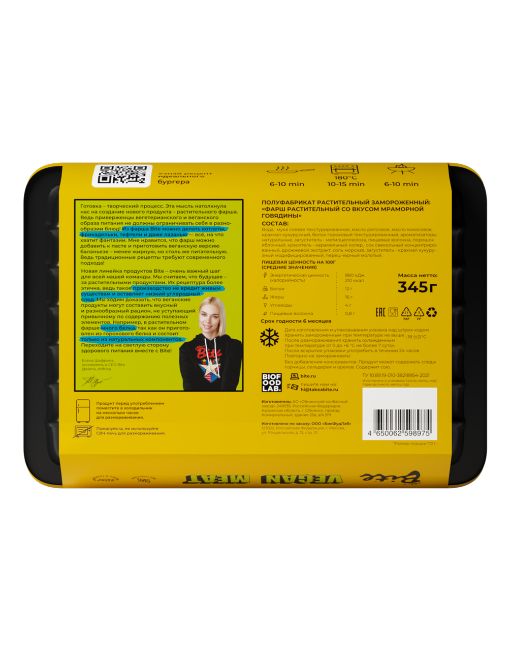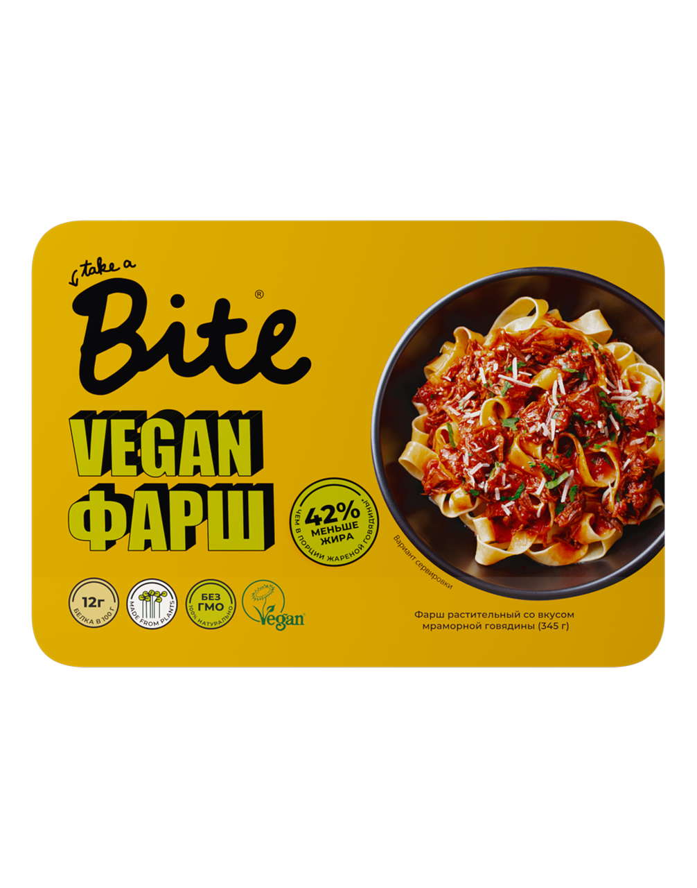 Растительный фарш Bite со вкусом мраморной говядины — инновационный продукт, созданный на 100% из натуральных компонентов и без вреда для животных и экологии. В основе рецептуры — богатый аминокислотами гороховый белок, соевая мука, растительная клетчатка, ферментированный свекольный сок, травы и специи. Текстура фарша в меру липкая и рассыпчатая, поэтому его удобно использовать для приготовления сложных блюд. В растительном фарше Bite 9 гр белка (на 100 гр), а жира на 42% меньше, чем в аналогичной порции жареной говядины. Продукт приготовлен по уникальной технологии, разработанной в BioFoodLab Research Center, не содержит добавленный сахар, глютен и имеет сертификат “без ГМО” и Vegan.