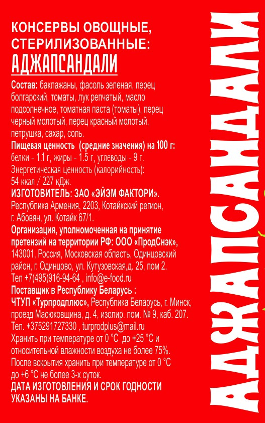 Аджапсандали Ecofood - это блюдо представляет собой овощное рагу, основным ингредиентом которого являются баклажаны. Обычно употребляется в качестве холодной закуски. Овощи для него сначала обжариваются по отдельности, а затем тушатся вместе в собственном соку.