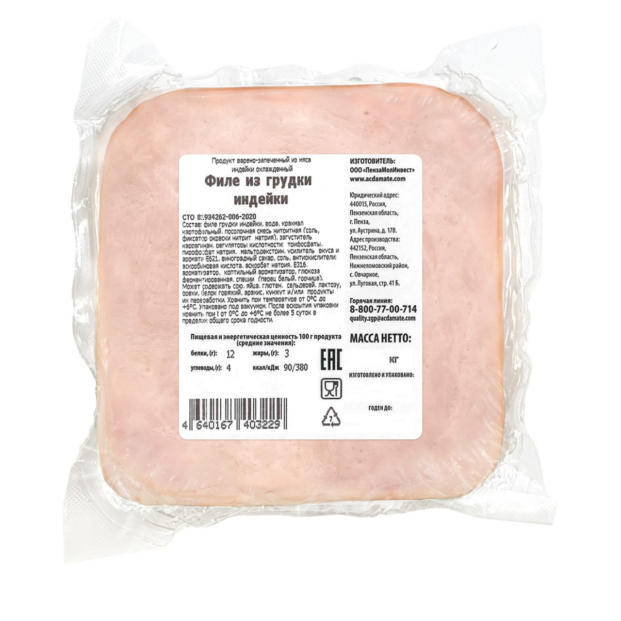Филе грудки индейки, вода, крахмал картофельный, посолочная смесь нитритная (соль,фиксатор окраски нитрит натрия), загуститель каррагинан, регуляторы кислотности: трифосфаты, пирофосфат натрия, мальтодекстрин, усилитель вкуса и аромата Е621, виноградный сахар, соль, антиокислители: аскорбиновая кислота, аскорбат натрия, Е316, ароматизатор, коптильный ароматизатор, глюкоза ферментированная, специи (перец белый, горчица). Может содержать сою, яйца, глютен, сельдерей, молоко (в т.ч. лактозу), орехи, арахис, кунжут, белок говяжий и/или продукты их переработки.
