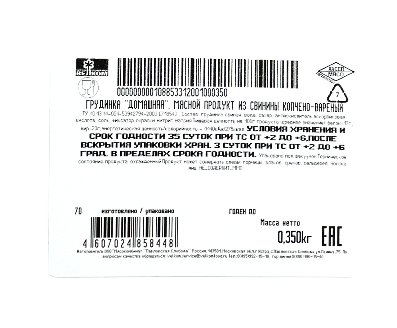 Грудинка Велком Домашняя копчено-вареная, 350г