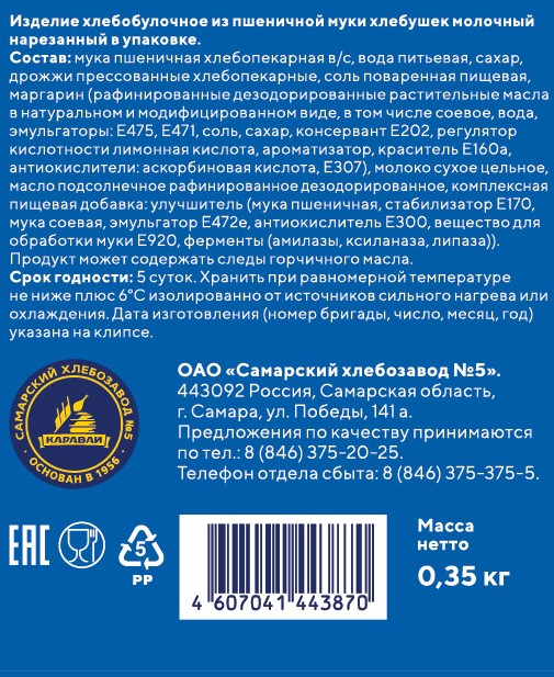 Мука пшеничная хлебопекарная высший сорт, вода питьевая, сахар, дрожжи прессованные хлебопекарные, соль поваренная пищевая, маргарин рафинированные дезодорированные растительные масла в натуральном и модифицированном виде, в том числе соевое, вода, эмульгаторы: е475, е471, соль, сахар, консервант е202, регулятор кислотности лимонная кислота, ароматизатор, краситель е160а, антиокислители: аскорбиновая кислота, е307, молоко сухое цельное, масло подсолнечное рафинированное дезодорированное, комплексная пищевая добавка: улучшитель мука пшеничная, стабилизатор е170, мука соевая, эмульгатор е472е, антиокислитель е300, вещество для обработки муки е920, ферменты амилазы, ксиланаза, липаза.