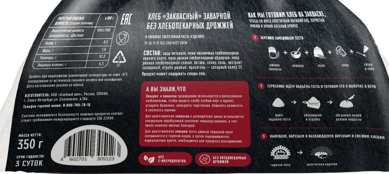 Хлеб на натуральной заварке и ржаной закваске; с воздушным темно-серым мякишем; с чуть сладковатым вкусом и солодовым ароматом.