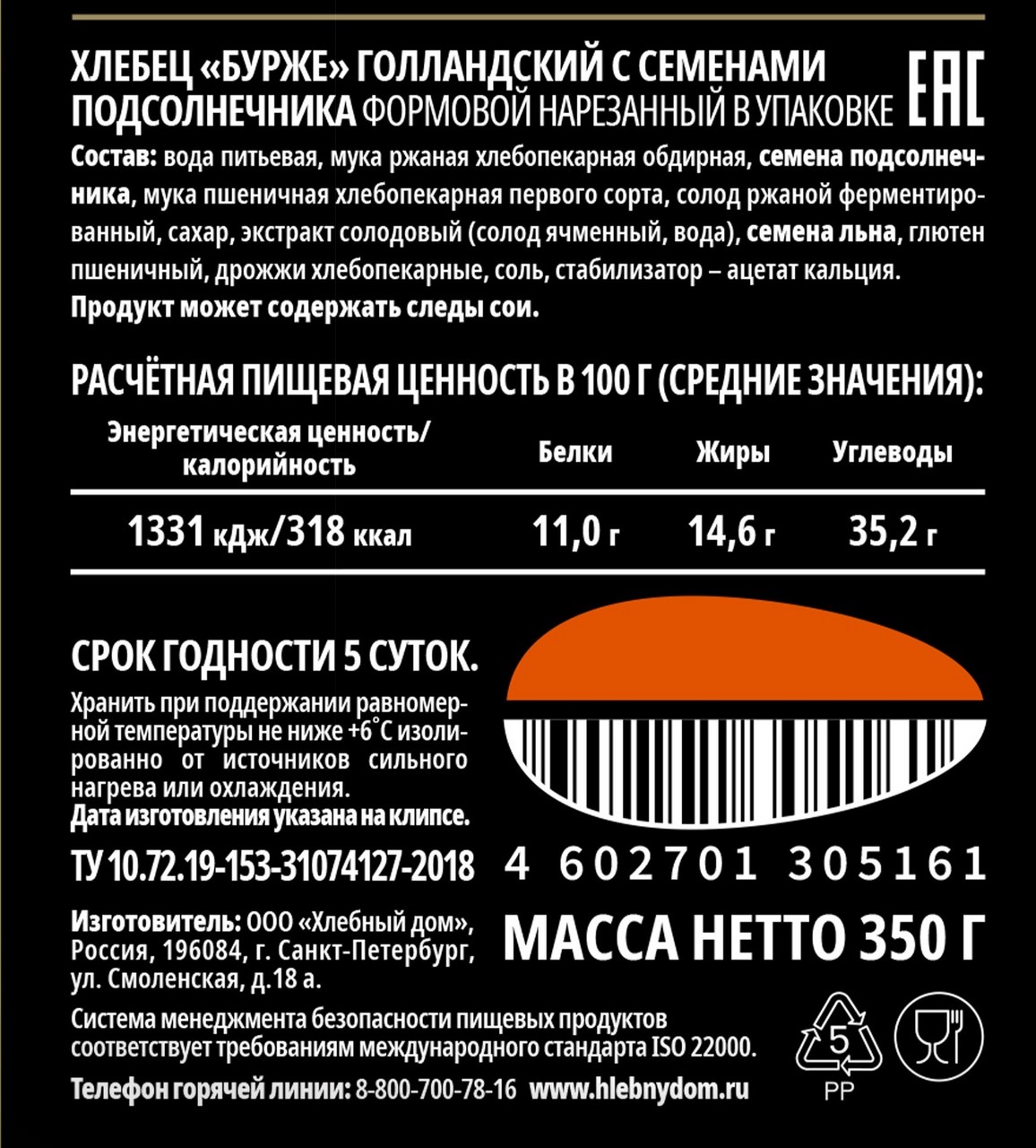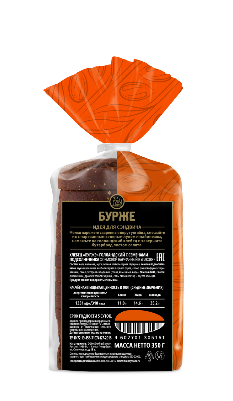 Хлеб Хлебный дом Бурже голландский с семенами подсолнечника, 350г