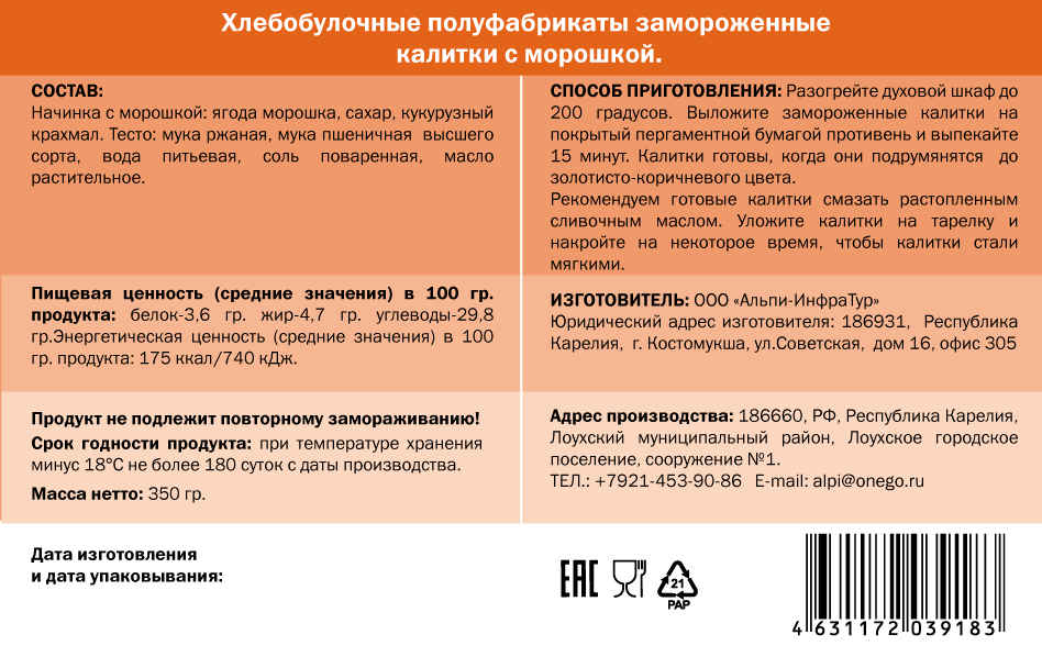 Начинка: ягода морошка, сахар, кукурузный крахмал. Тесто: мука ржаная, мука пшеничная высшего сорта, вода питьевая, соль поваренная, масло растительное.