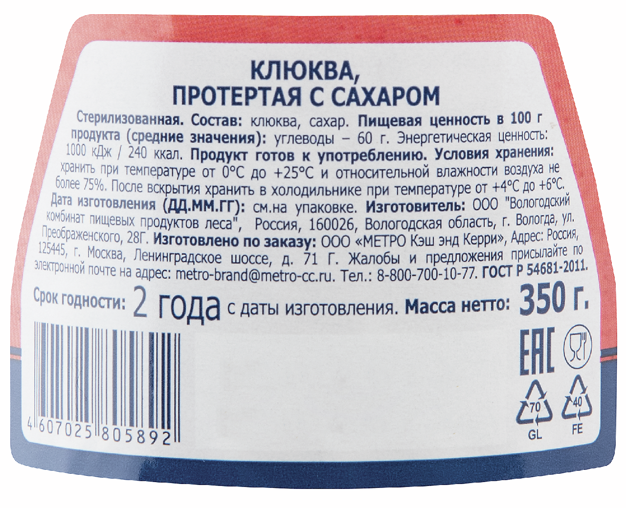 Клюква протертая с сахаром, стерилизованная. Применяемый при стерилизации щадящий температурный режим, отсутствие искусственных консервантов, ароматизаторов и красителей позволяет сохранить натуральный вкус и целебные свойства лесной ягоды-клюквы.