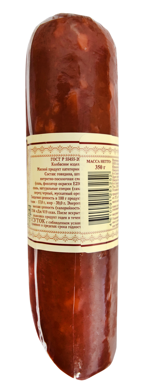 Говядина, шпик, нитритно-посолочная смесь соль, фиксатор окраски Е250, соль, натуральные специи сахар, перец чёрный, мускатный орех.