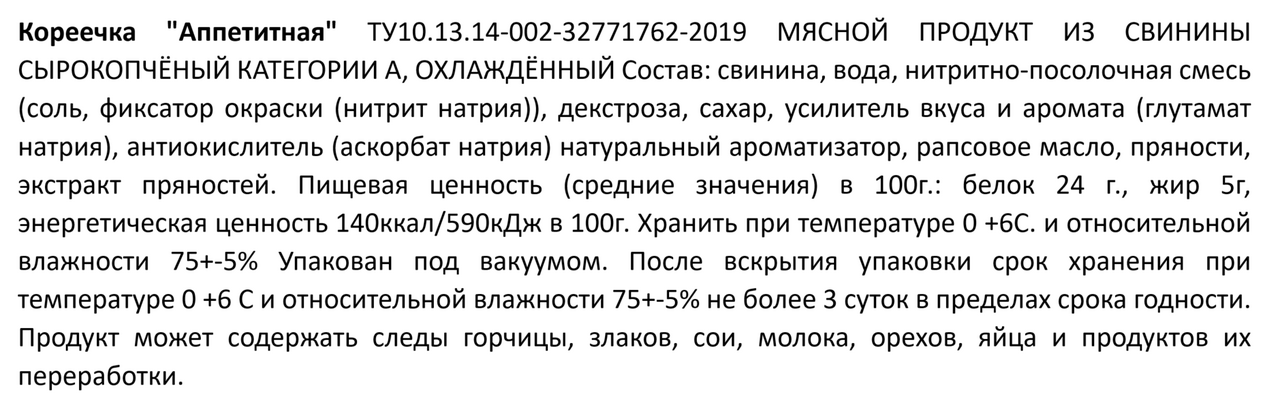 Свинина, вода, нитритно-посолочная смесь, декстроза, сахар, усилитель вкуса и аромата, антиокислитель, натуральный ароматизатор, рапсовое масло, пряности, экстракт пряностей.