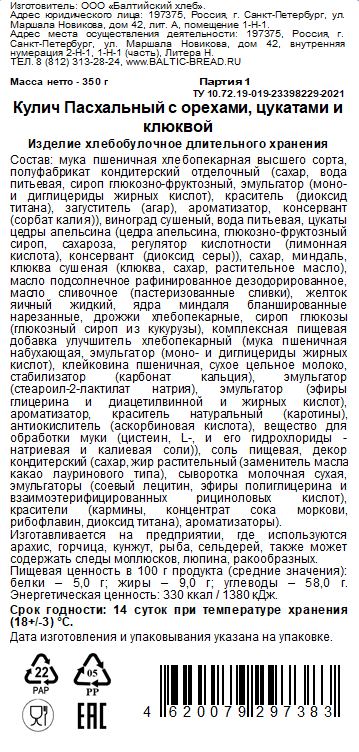 Кулич Пасхальный Балтийский хлеб орехи, цукаты и клюква, 350г
