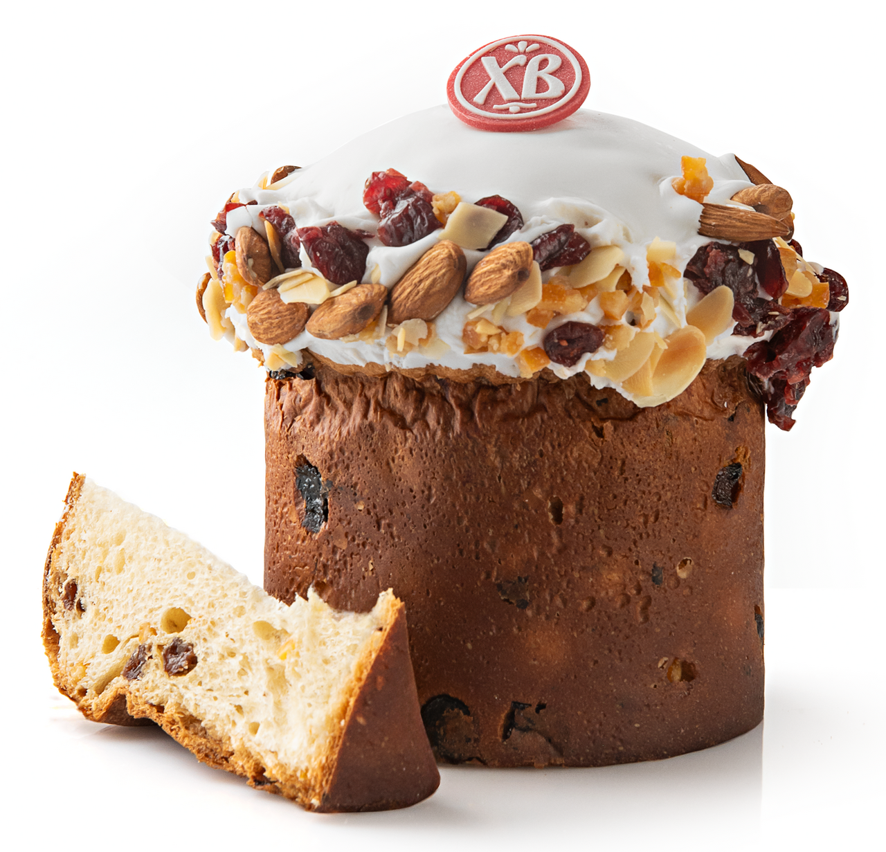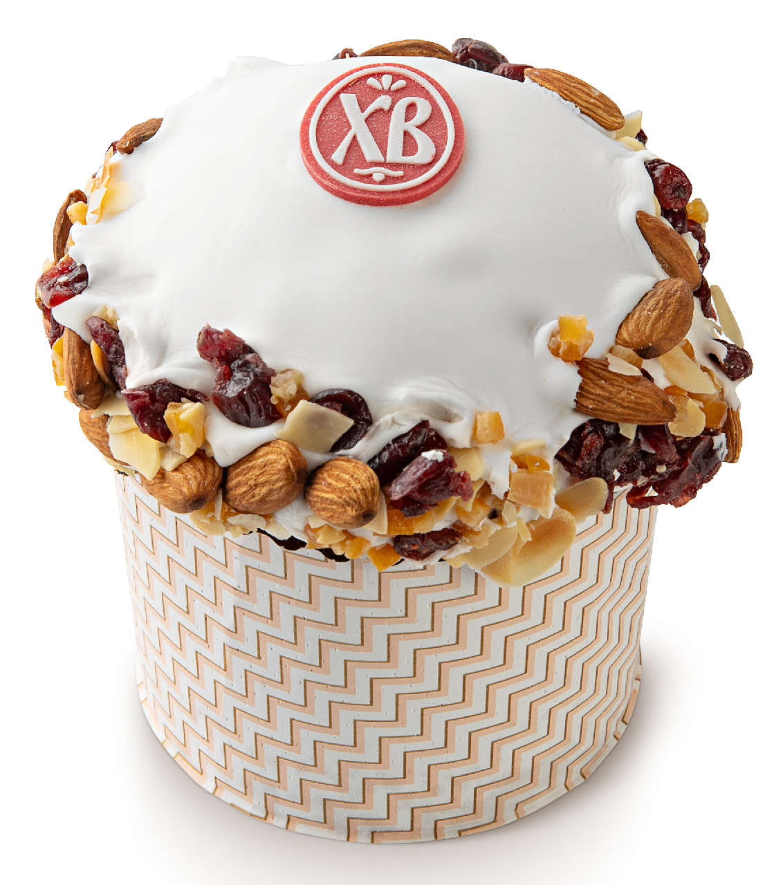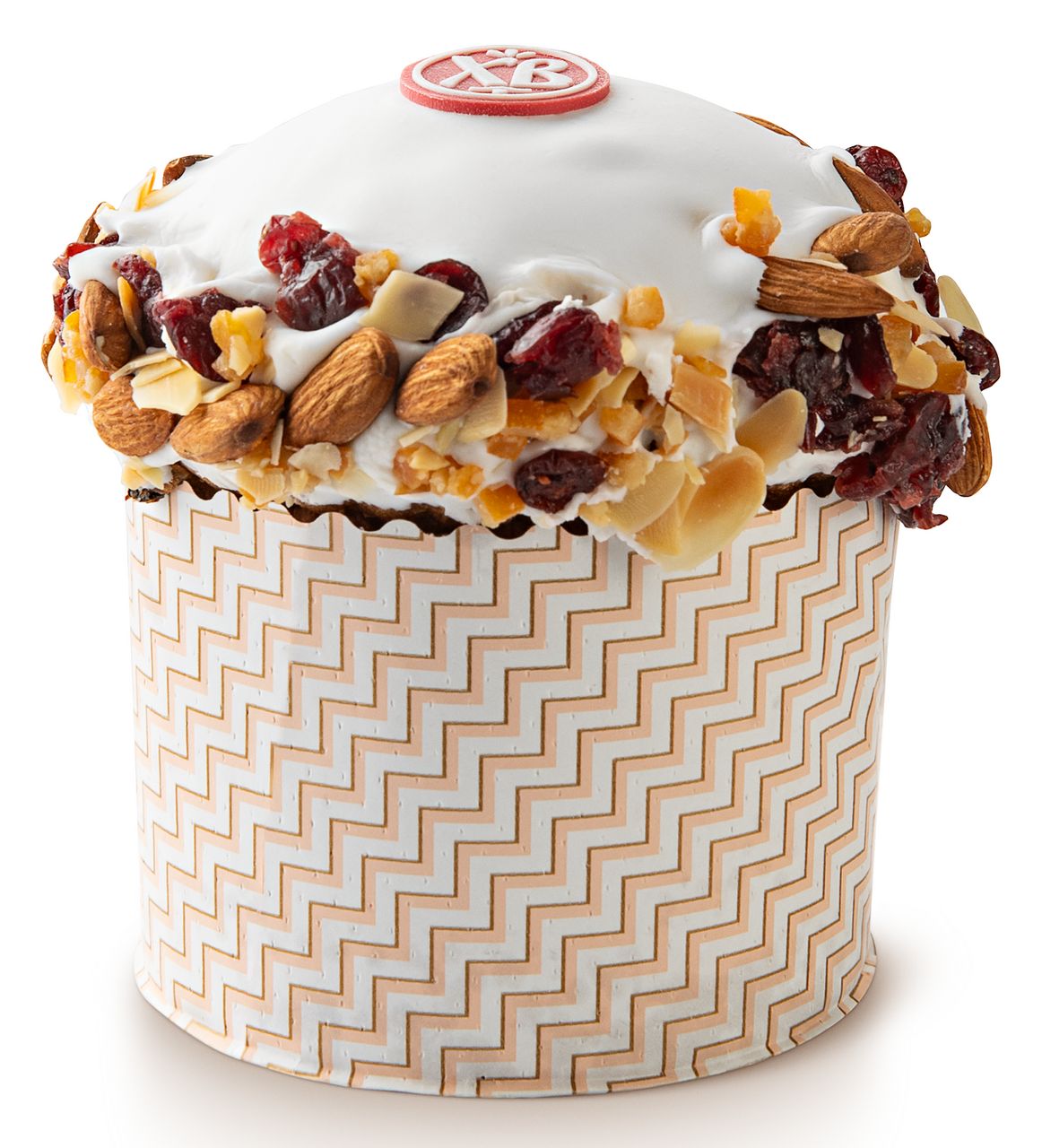 Средний пасхальный кулич из сдобного дрожжевого теста, с добавлением изюма и апельсиновых цукатов. Украшен сладкой сахарной помадкой, орехами и сушеной клюквой.