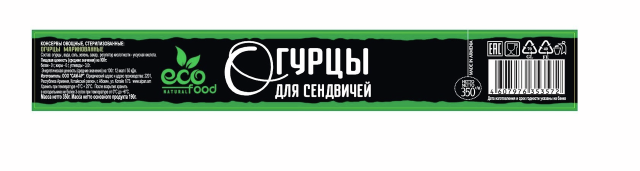Огурцы маринованные EcoFood Для сэндвичей, 350г