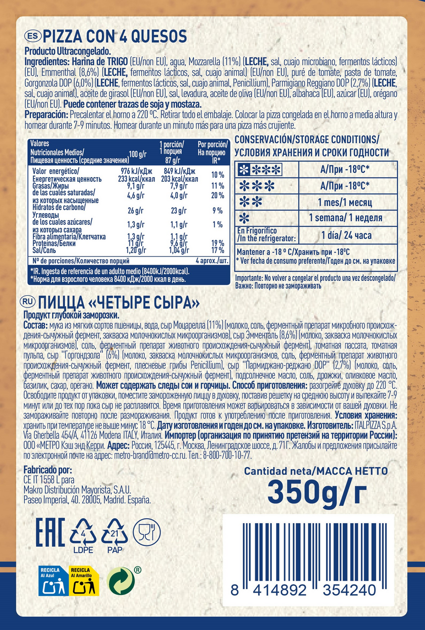 METRO Chef Пицца 4 сыра замороженная 27см, 350г отличается тонким тестом с нежной начинкой и насыщенным ярким вкусом.