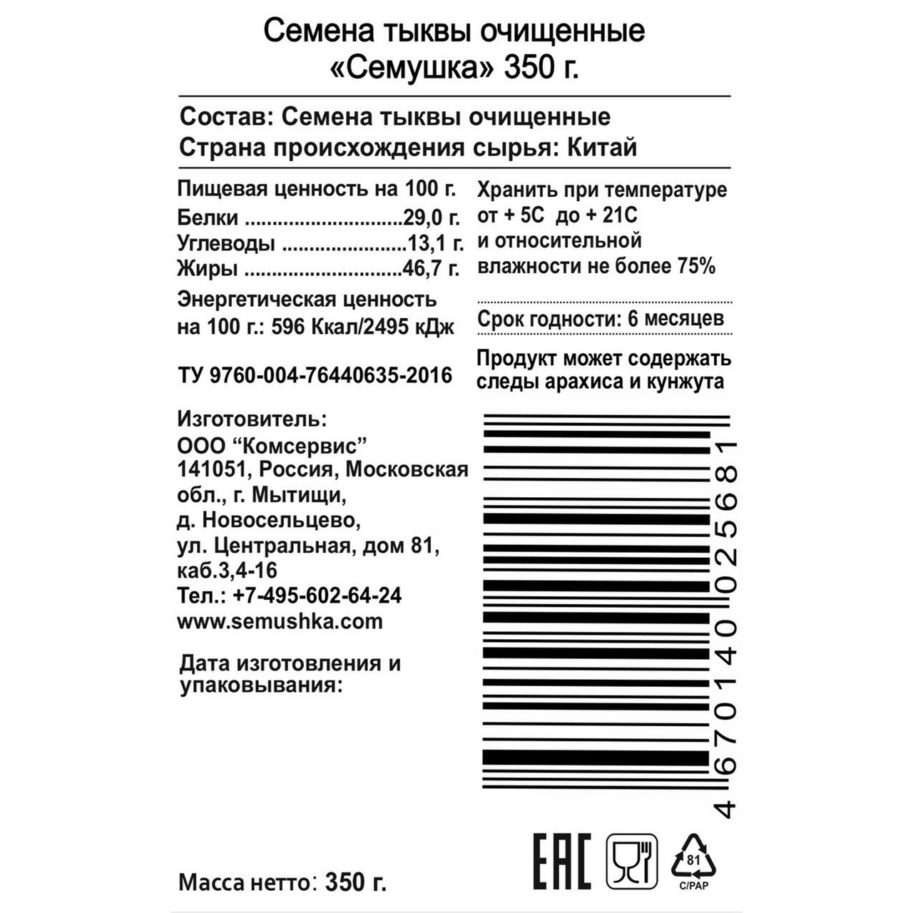 Семена тыквы Семушка очищенные, 350г