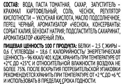 Вода, паста томатная, сахар, крахмал картофельный, соль, чеснок, регулятор кислотности — уксусная кислота, масло подсолнечное, перец черный, ароматизатор Чеснок, консерванты: сорбат калия, бензоат натрия; подсластитель сахаринат, ароматизатор Жареный лук.