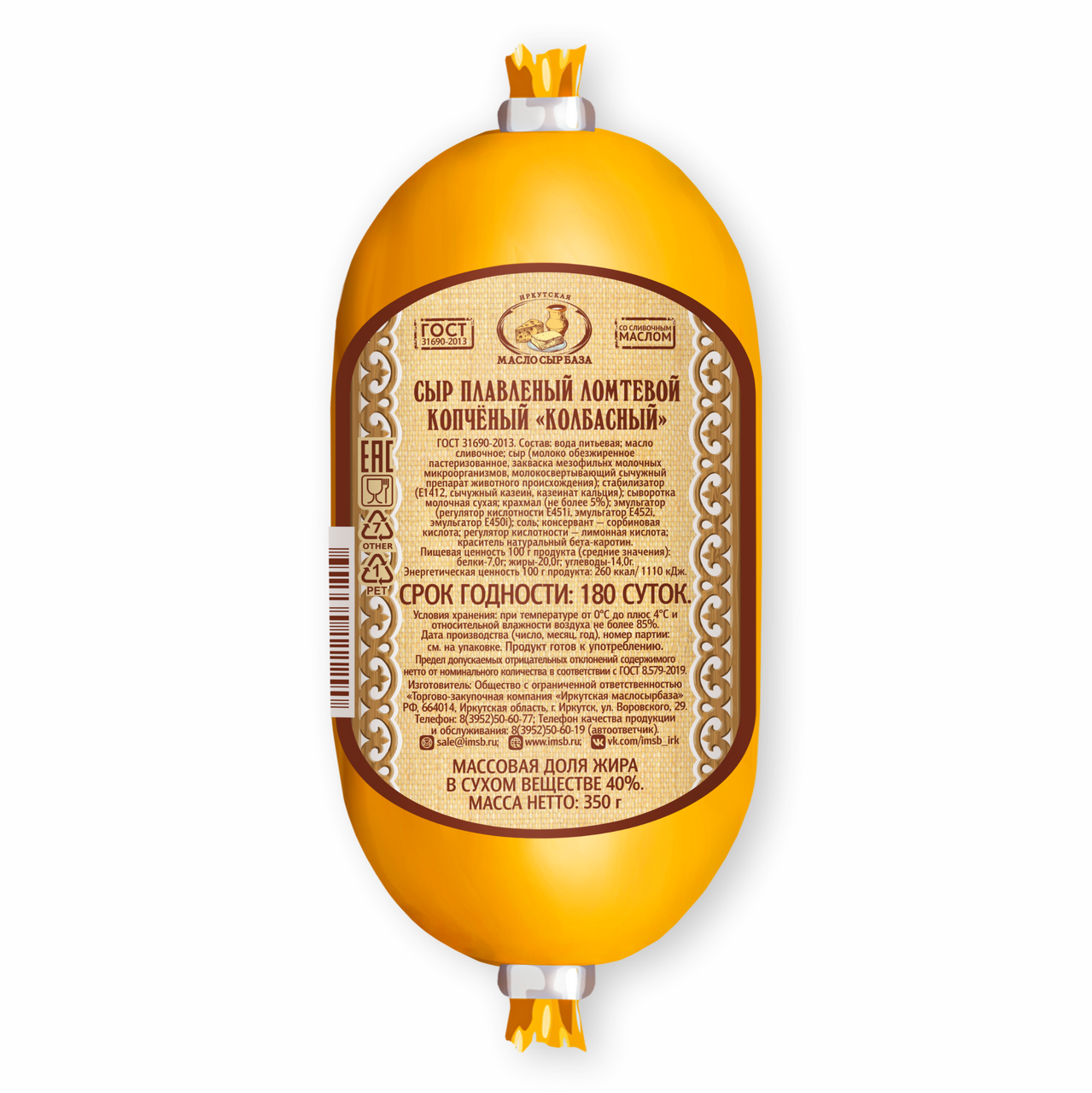 Натуральный Колбасный плавленый сыр, хорошо прокопчённый на буковой и ольховой щепе. Высокое качество и отменный вкус этого продукта - отличный выбор для тех, кто знает толк в приготовлении питательных бутербродов, вкуснейших овощных салатов и пикантных блюд из рыбы, птицы и мяса. Производство копчёного сыра – это давняя традиция предприятия Иркутская маслосырбаза, которые являются единственным производителем подобного продукта в Иркутской области. Сыр производится из натуральных ингредиентов – сыров, молока и сливочного масла, а затем проходит процедуру копчения и топления в натуральном дыму.