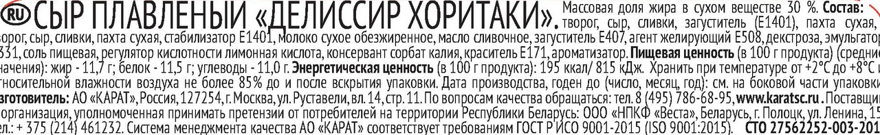 Творог, сыр, сливки, пахта сухая, стабилизатор E1401, молоко сухое обезжиренное, масло сливочное, загуститель E407, агент желирующий Е508, декстроза, эмульгатор E331, соль пищевая, регулятор кислотности лимонная кислота, консервант сорбат калия, краситель Е171, ароматизатор.