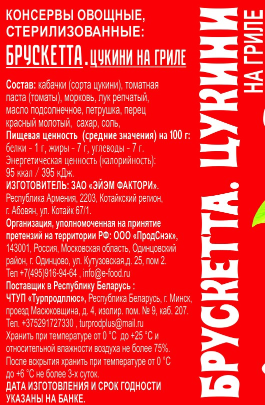 Брускетта Цукини Ecofood - это высококачественный продукт из Армении, который станет отличным дополнением к вашему столу. Продукт изготовлен из отборных кабачков, которые прошли тщательную подготовку перед запеканием. Это придает овощам уникальный аромат и вкус.
