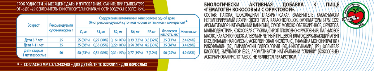Патока, шоколадная глазурь (сахар, заменитель какао-масла нетемперируемый лауринового типа, какао-порошок, эмульгаторы Е476, Е322, ароматизатор натуральный ванилин), сухое молоко обезжиренное, фруктоза, мальтодекстрин, кокосовая стружка, сироп глюкозно-фруктозный, пальмовое масло, какао-порошок, альбумин черный пищевой, влагоудерживающий агент Е422, витаминная смесь (L-аскорбиновая кислота (С), тиамина мононитрат (В1), рибофлавин (В2), пиридоксин гидрохлорид (В6), никотинамид (РР), фолиевая кислота), эмульгатор Е322, ароматизатор натуральный "Сливки" (кокосовые), аскорбиновая кислота Е300.