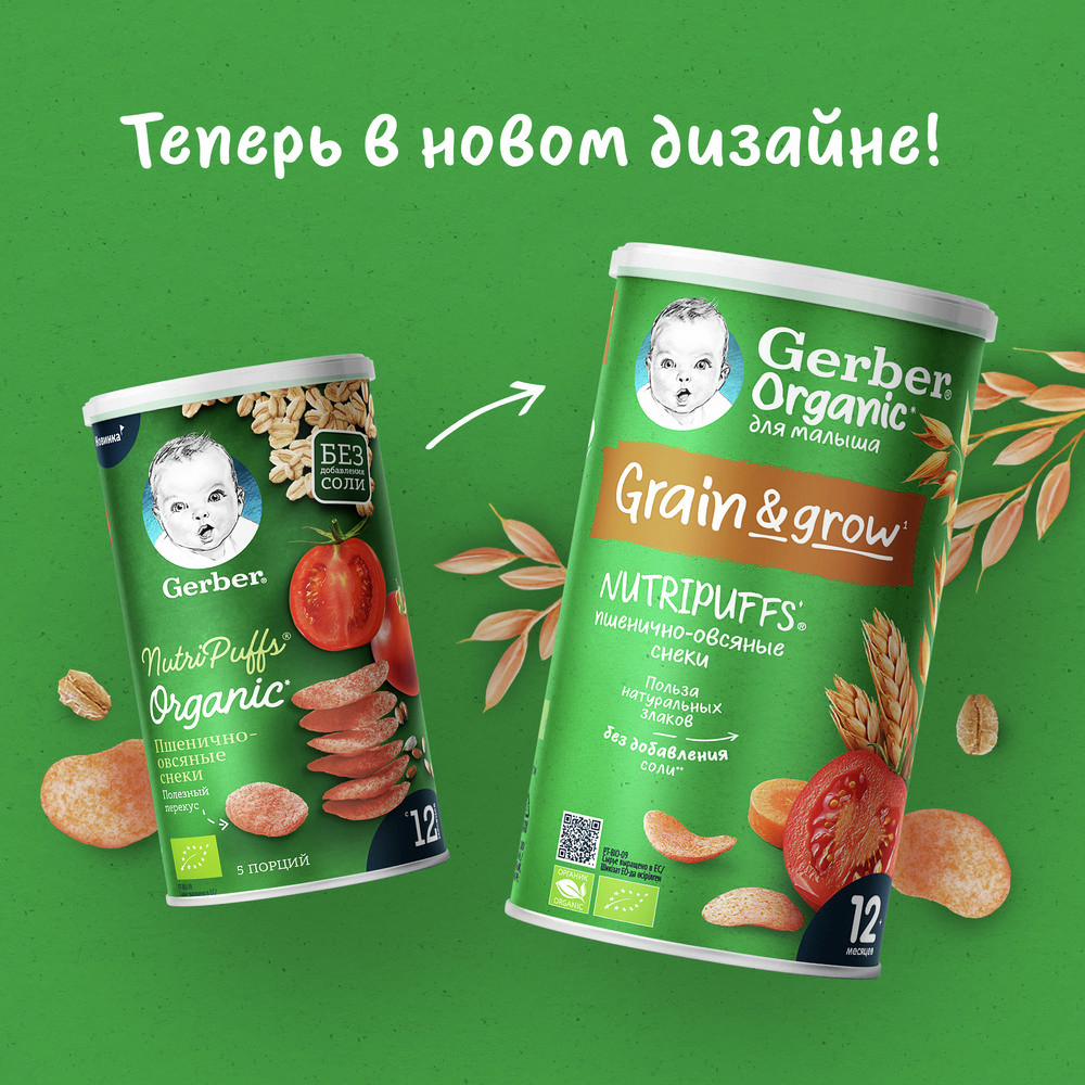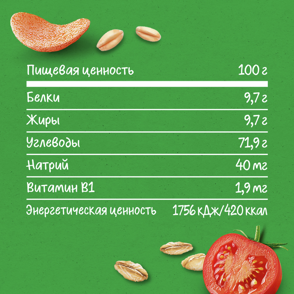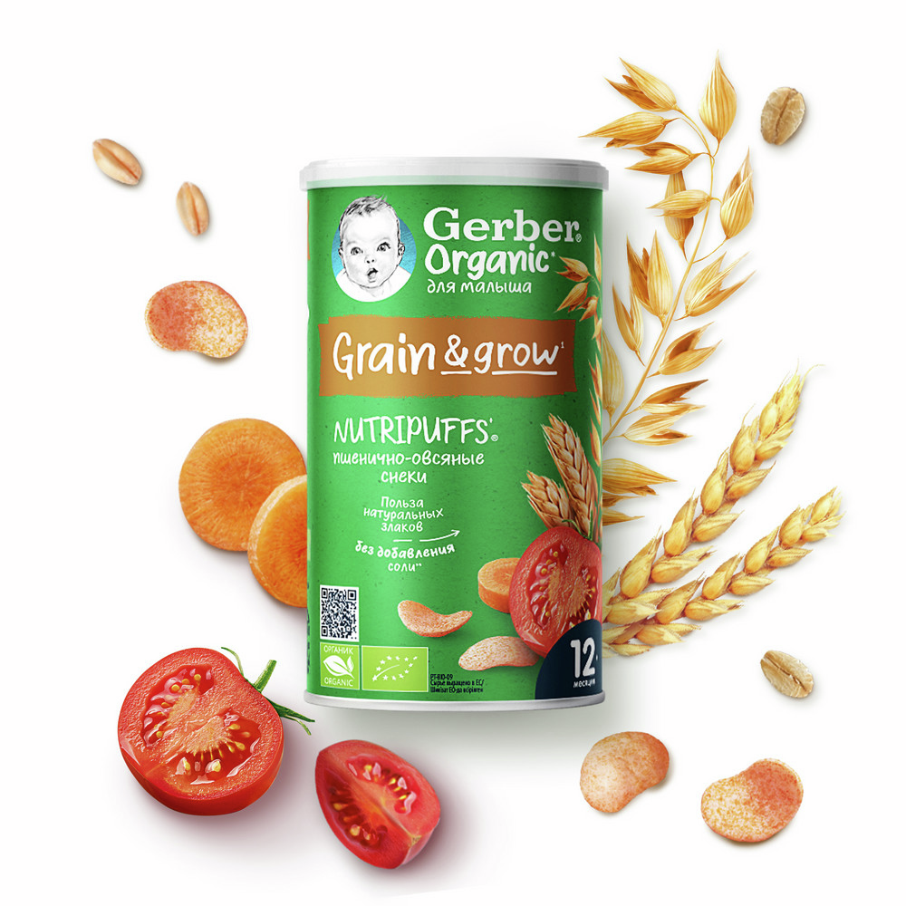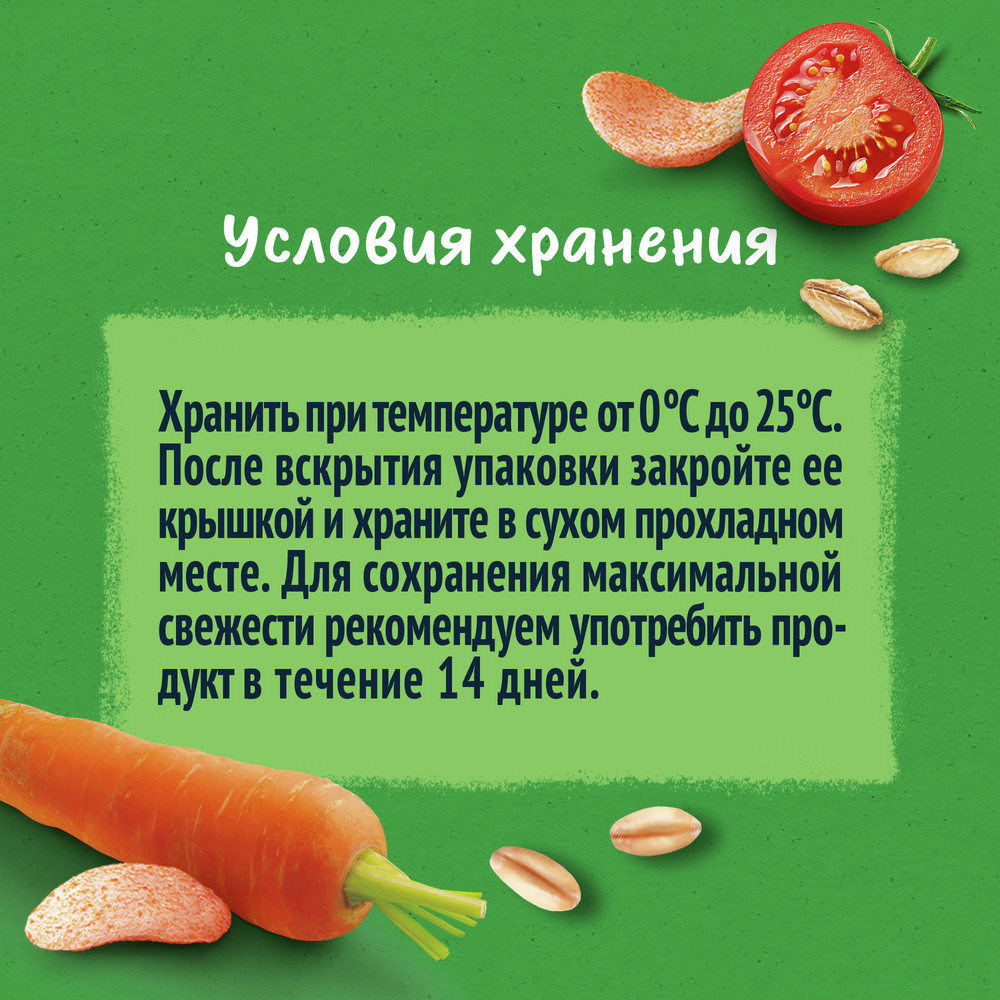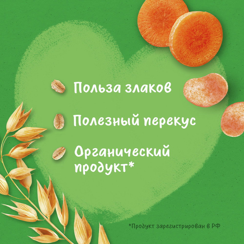 Пшенично-овсяные снеки с томатом и морковью - вкусный и полезный перекус, специально разработанный для годовалого малыша, который может остаться его любимым лакомством и в более старшем возрасте. Этот продукт - здоровое сочетание цельных злаков и овощей, выращенных по принципам земледелия. Правильные пищевые пристрастия закладываются в раннем возрасте, поэтому важно научить малыша питаться здоровыми продуктами не только во время основных приемов пищи, но даже при перекусах.