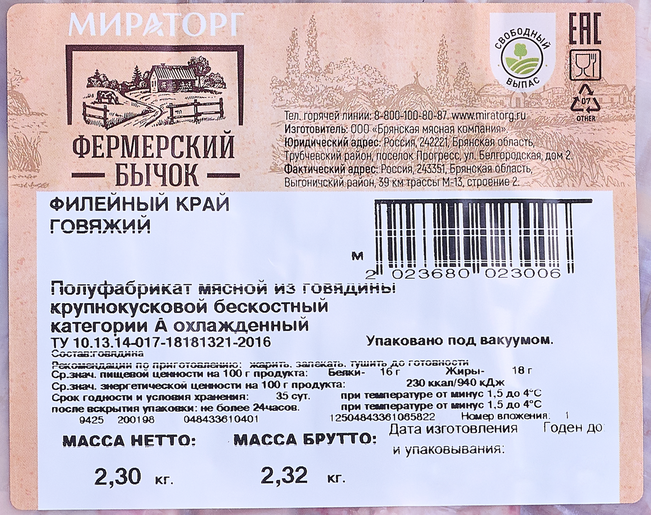 Край филейный говяжий Мираторг Фермерский бычок замороженный, ~3.5кг