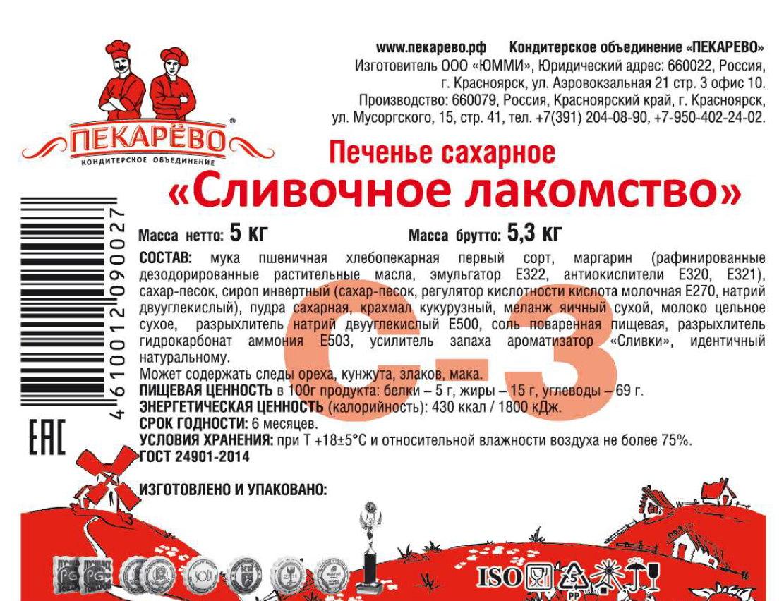 Мука пшеничная высший сорт, пудра сахарная, маргарин, шоколадная глазурь, сироп инвертный (сахар песок, лимонная кислота, сода питьевая), молоко цельное сухое, яичный порошок, сода питьевая, соль, ароматизатор, идентичный натуральному Ванилин. УГЛЕАММОНИЙНАЯ СОЛЬ.