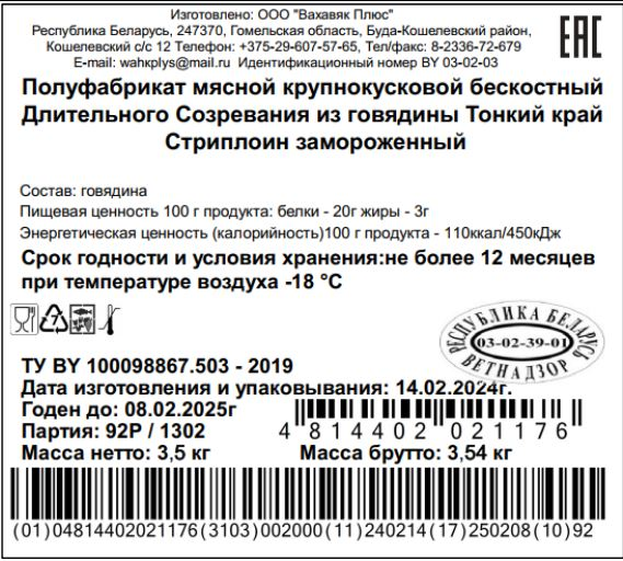 Тонкий край говяжий Вахавяк Плюс Стриплойн замороженный, ~3.5кг