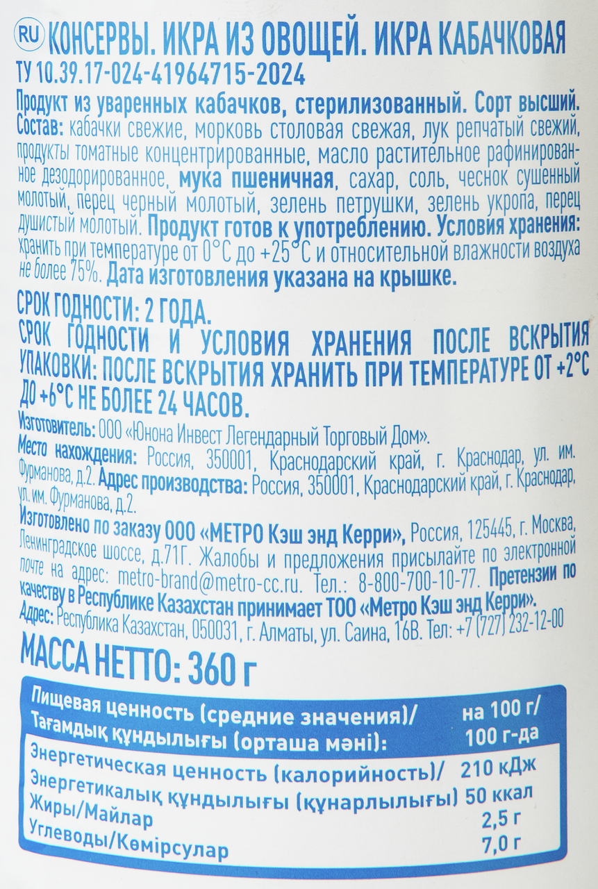 Кабачки свежие, морковь столовая свежая, лук репчатый свежий, продукты томатные концентрированные, масло рафинированное дезодорированное, мука пшеничная, сахар, соль, чеснок сушёный молотый, перец чёрный молотый, зелень петрушки, зелень укропа, перец душистый молотый.