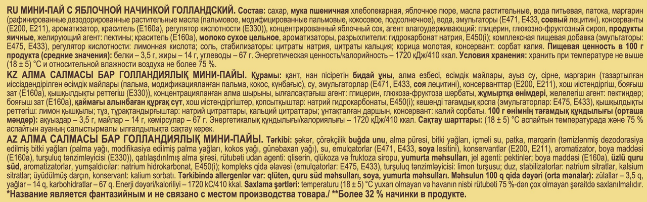 Сахар, мука пшеничная хлебопекарная, яблочное пюре, масла растительные, вода питьевая, патока, маргарин (рафинированные дезодорированные растительные масла (пальмовое, модифицированные пальмовые, кокосовое, подсолнечное), вода, эмульгаторы (Е471, Е433, соевый лецитин), консерванты (Е200, Е211), ароматизатор, краситель (Е160а), регулятор кислотности (Е330)), концентрированный яблочный сок, агент влагоудерживающий: глицерин, глюкозно-фруктозный сироп, продукты яичные, желирующий агент: пектины, краситель (Е160а), молоко сухое цельное, ароматизаторы, разрыхлители: гидрокарбонат натрия, Е450(i), комплексная пищевая добавка (эмульгаторы: Е475, Е433), регулятор кислотности: лимонная кислота, соль, стабилизаторы: цитраты натрия, цитраты кальция; корица молотая, консервант: сорбат калия.