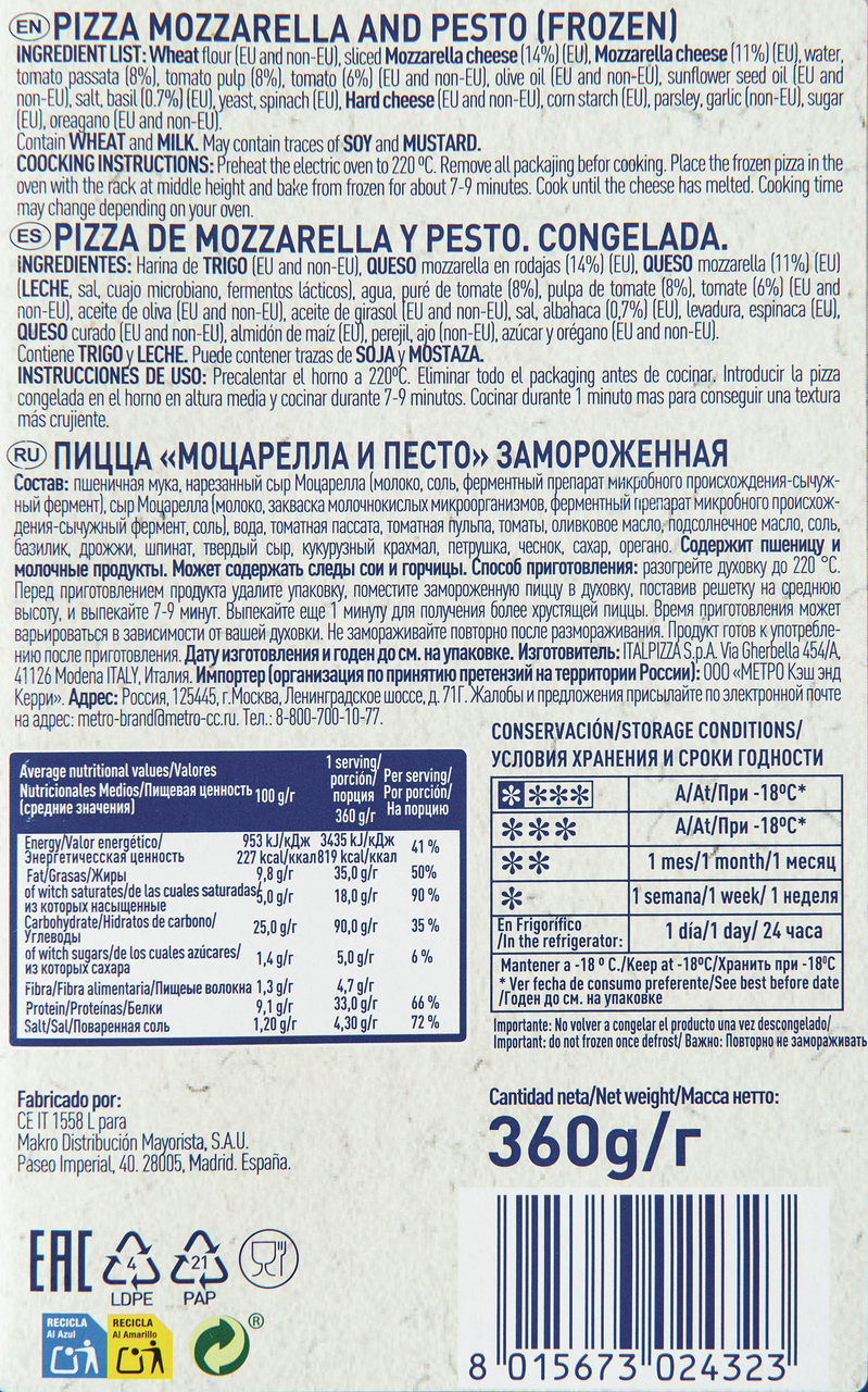 Мука пшеничная п/с, 23% пюре томатное, 10% сыр твердый Моцарелла (молоко нормализованное пастеризованное, соль пищевая, молокосвертывающий ферментный препарат микробного происхождения, термофильные молочнокислые микроорганизмы, уплотнитель: хлорид кальция), 9,4% томаты Черри быстрозамороженные, 8,1% мясная продукция: колбасное изделие сырокопченое Салями (свинина, шпик, соль пищевая, специи, декстроза, сироп глюкозный, фиксатор окраски: нитрит натрия, антиокислитель: экстракты розмарина, ароматизатор, стартовые культуры), масло рапсовое рафинированное дезодорированное, сыр Эдам (молоко нормализованное пастеризованное, соль пищевая, мезофильные молочнокислые микроорганизмы, молокосвертывающий ферментный препарат микробного происхождения. уплотнитель: хлорид кальция), вода питьевая, дрожжи хлебопекарные, сахар, базилик, соль пищевая, петрушка, шпинат, масло оливковое нерафинированное высшего качества, загуститель: дикрахмалфосфат, специи, сок лимонный, чеснок, эмульгатор: моно- и диглицериды жирных кислот, орегано, белок рапсовый и кукурузный, мальтодекстрин, сахар карамелизованный.